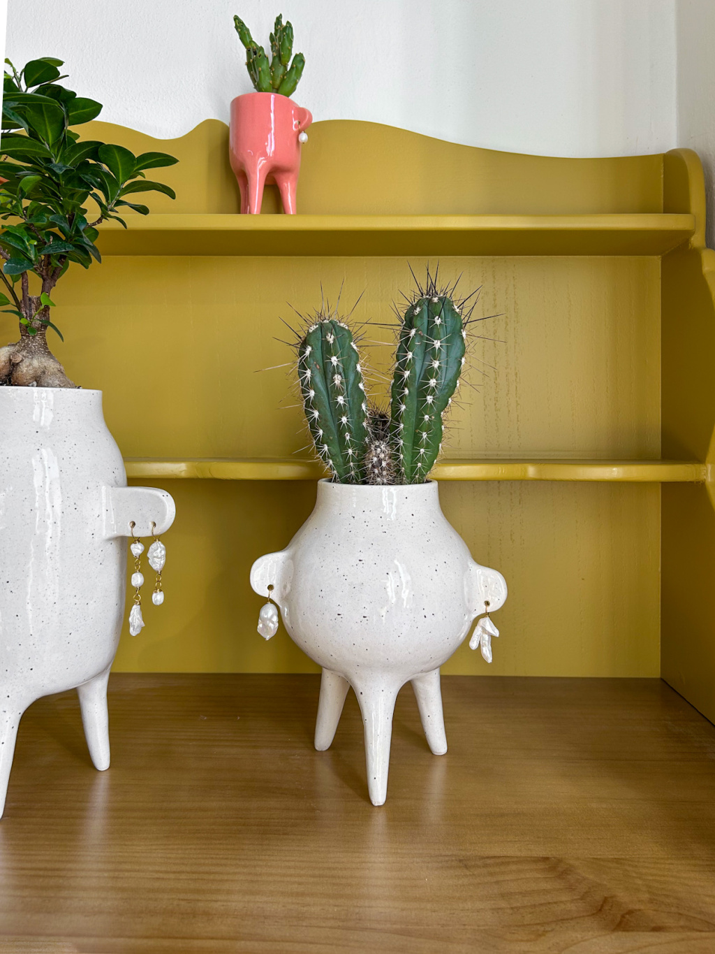 Bílý květináč s perlovými náušnicemi a kaktusem