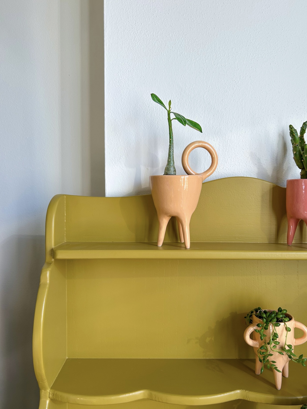 Ručně vytvořený květináč z pálené keramiky s velkým uchem (na obrázku vlevo nahoře). Květináč je doplněn o Adenium zasazené v substrátu.