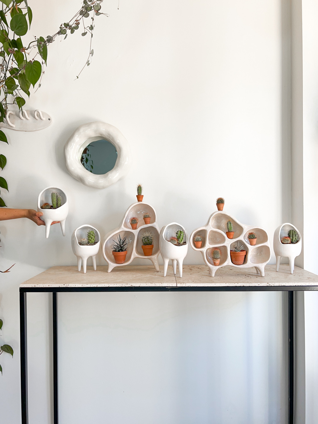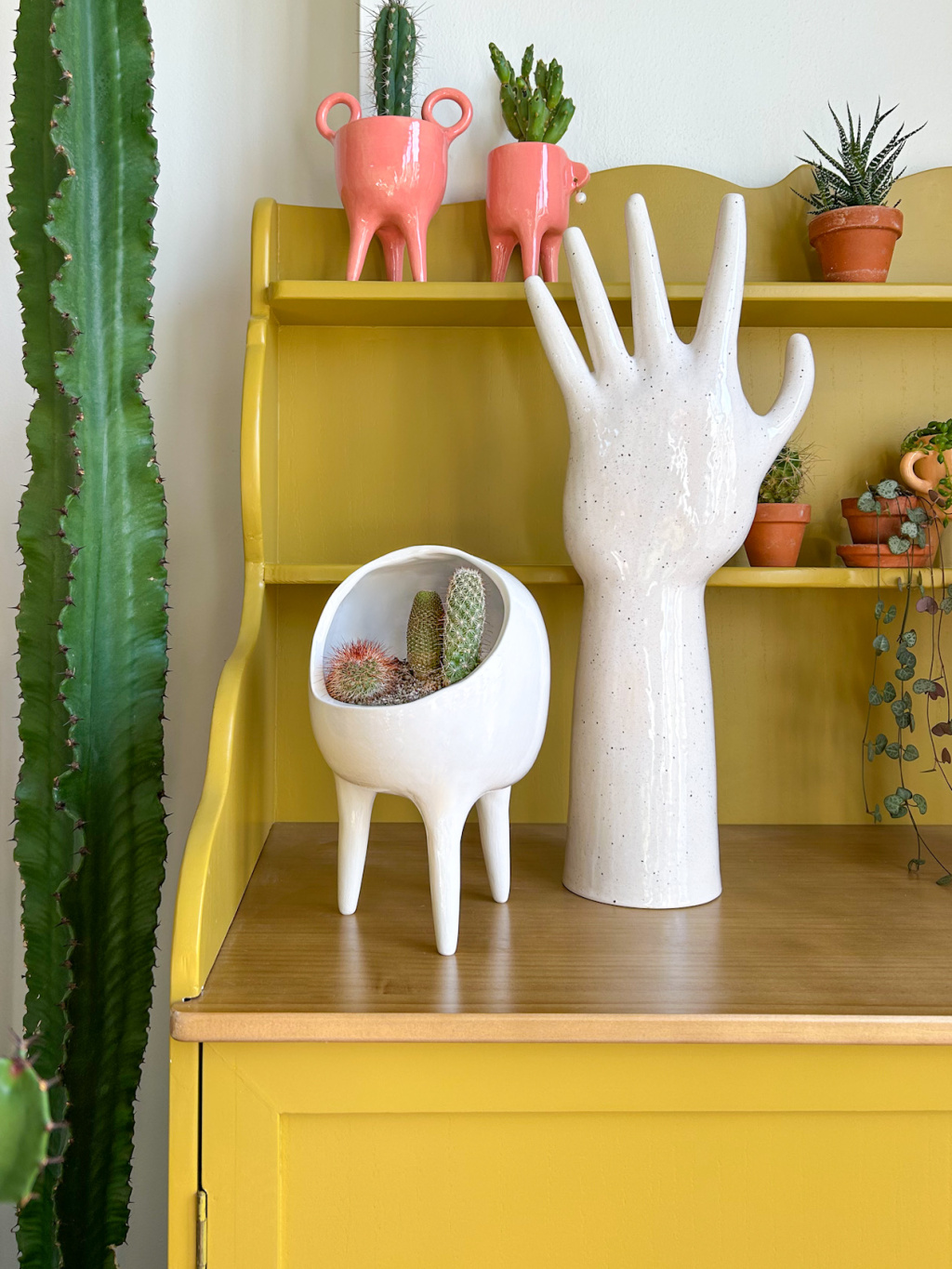 Ručně vytvořená nádoba s bílou glazurou na třech nožkách z pálené keramiky (jedná se o výrobek vlevo dole). Váza je doplněna o kaktusy zasazené v substrátu.