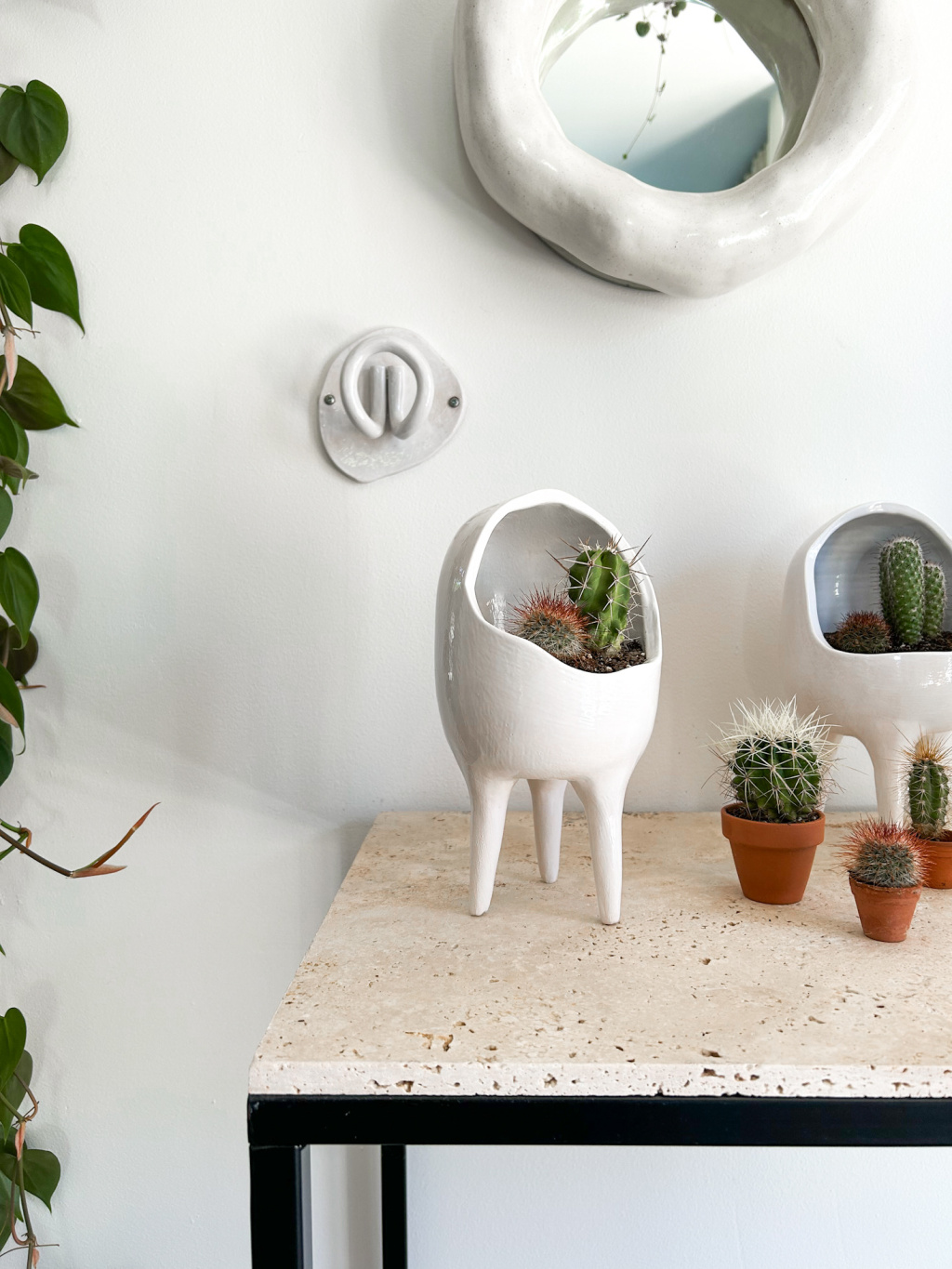Ručně vytvořená nádoba na třech nožkách z pálené keramiky. Váza je doplněna o kaktusy zasazené v substrátu.