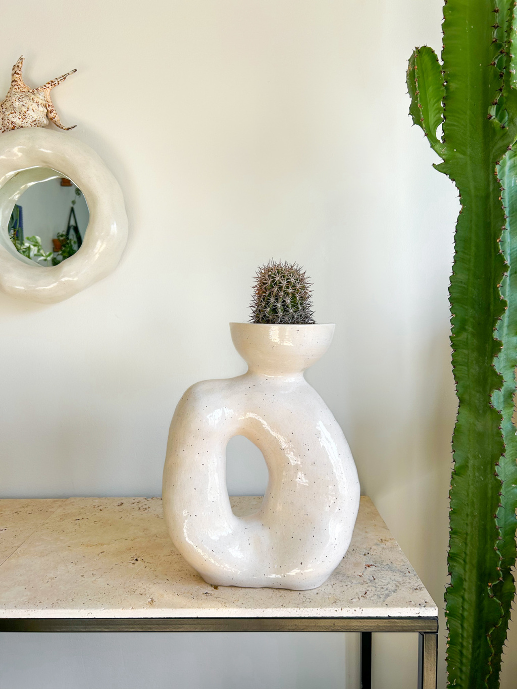 Ručně vytvořená socha z pálené keramiky. Socha je doplněna o kaktus zasazený v substrátu.
