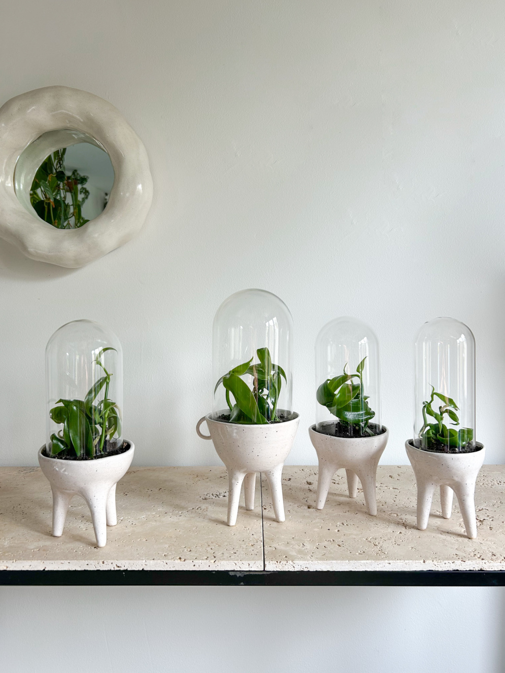 Ručně vytvořená nádoba na třech nožkách z pálené keramiky. Nádoba je doplněna o skleněný poklop zajišťující optimální klima a Vanilkovník.
