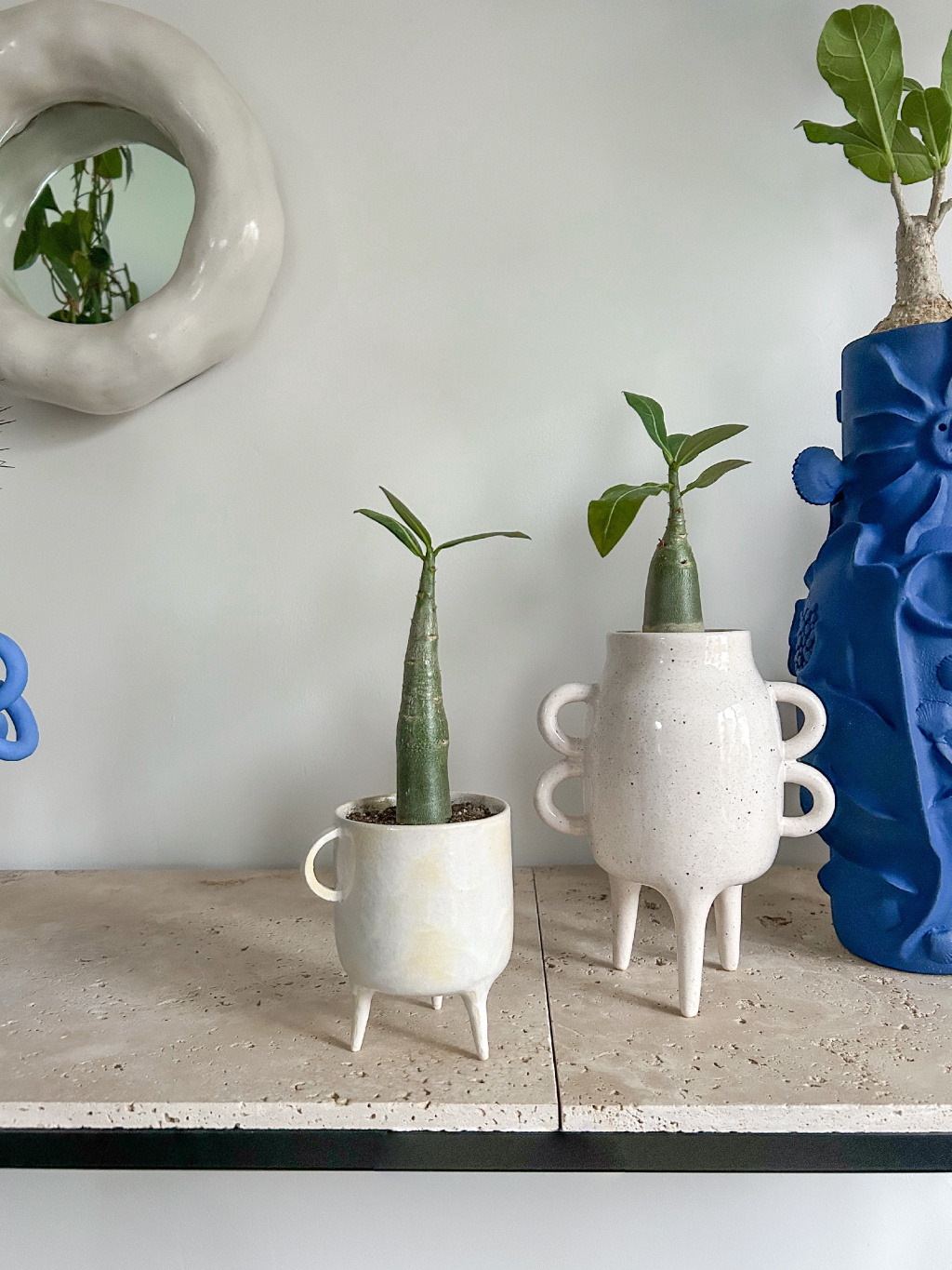 Ručně vytvořená nádoba na třech nožkách z pálené keramiky. Váza je doplněna o Adenium zasazené v substrátu (jedná se o výrobek úplně vlevo).
