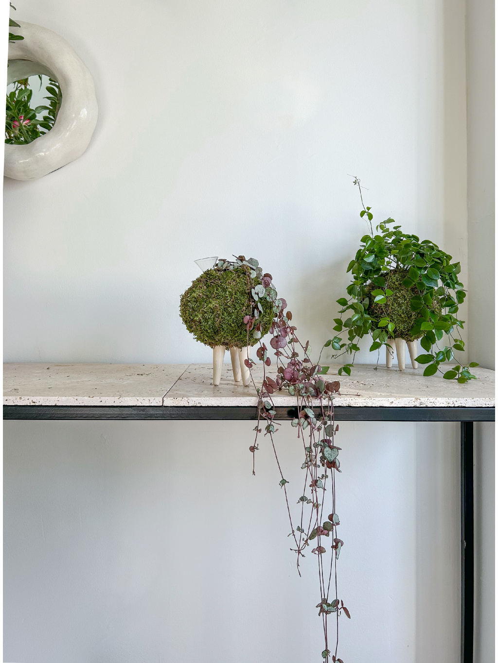 Mechová kokedama s rostlinou Ceropegia Woodii neboli Svícník se skleněnou nálevkou a jedinečným systémem zalévání běžnou konvičkou. Kokedama je postavena na zabudované keramické trojnožce.