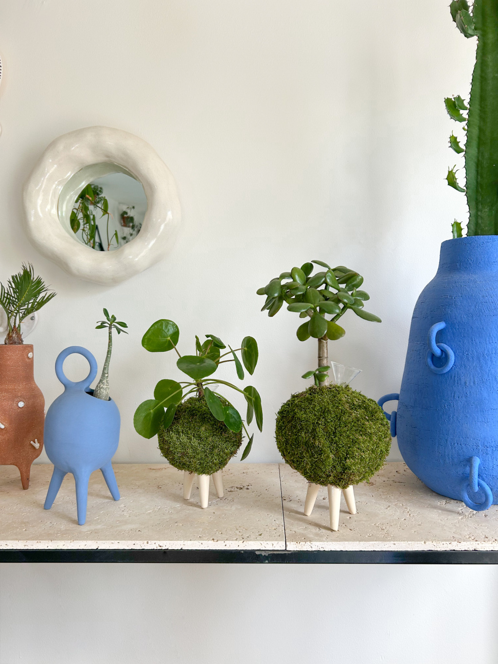 Mechová kokedama s Tlusticí, na ručně vyrobené keramické trojnožce a s a jedinečným systémém zalévání běžnou konvičkou.