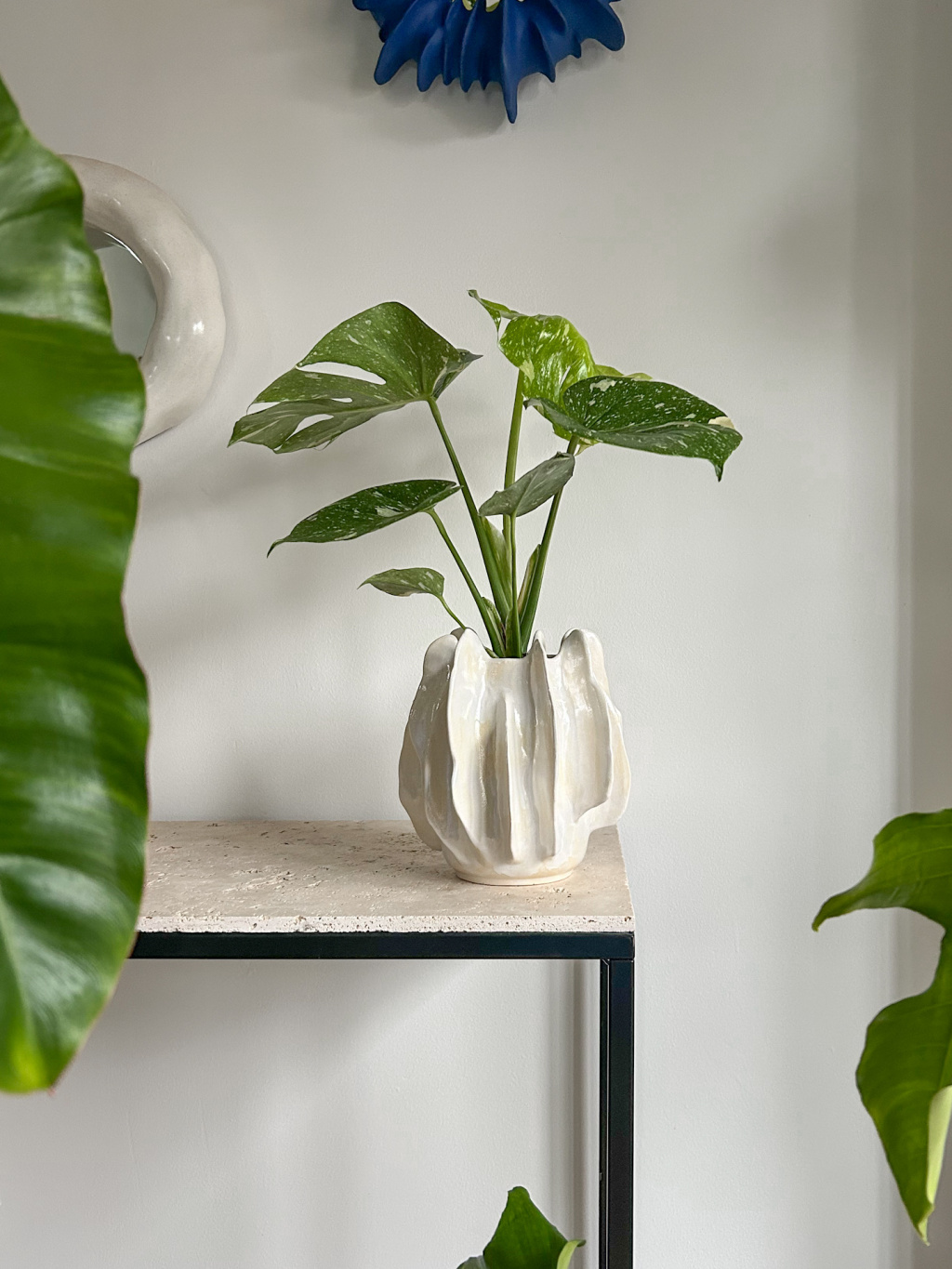 Keramická váza je ručně vyrobena u mě v ateliéru. Součástí je také pokojovka jménem Monstera Deliciosa Albo Variegata, které vyhovuje umístění na světlém místě a střední zálivka cca 1x za 7 dní. Rostlina je zasazena v ručně namíchaném substrátu s bohatou vrstvou keramzitu na dně, kvůli zachycení přebytečné zálivky (je ale vhodné kvůli absenci odtoku zalévat spíše mírněji).