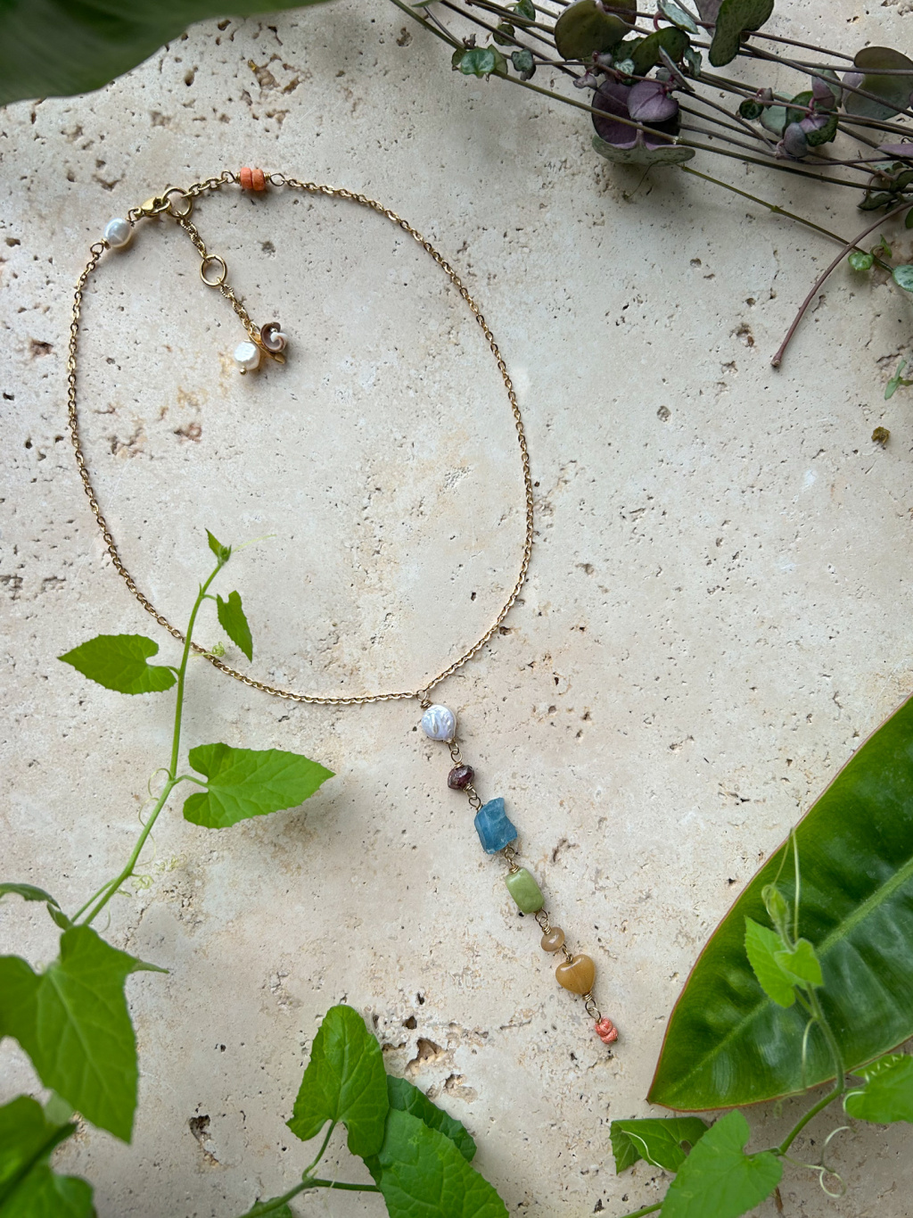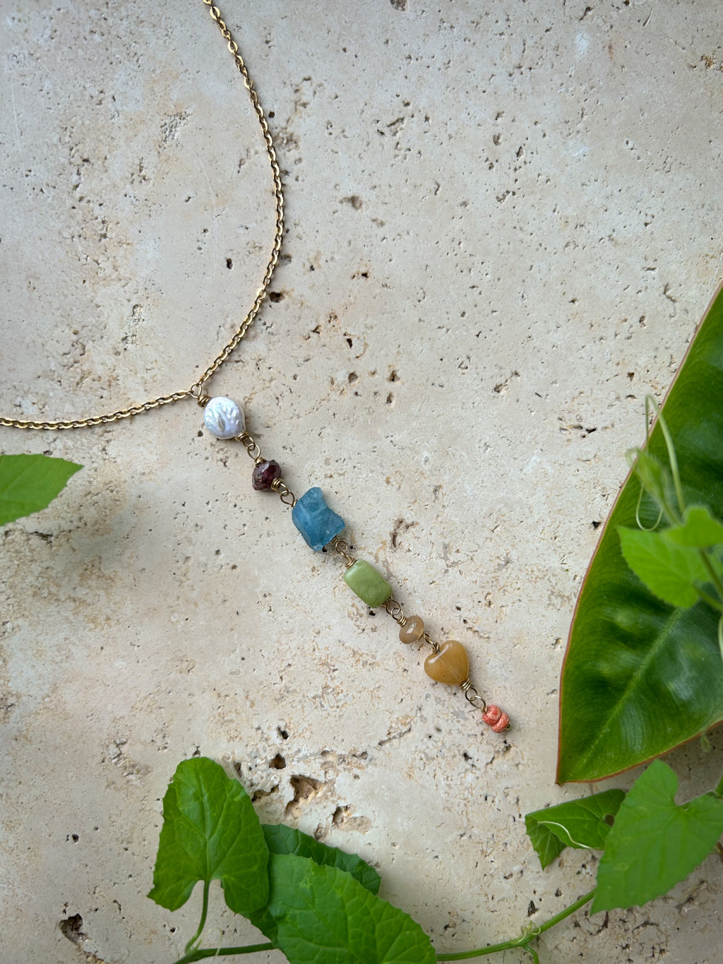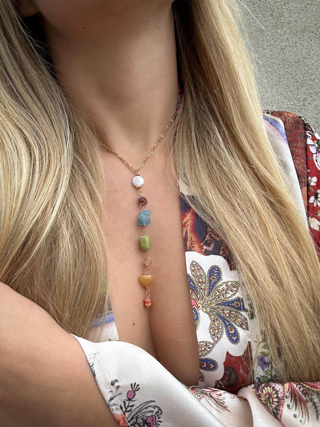 Ručně vyrobený náhrdelník znázorňující sedm hlavních energetických center, vašich čaker. Šperk je vytvořen z pravých perel, minerálního kamene a pozlacené chirurgické oceli. Noste tento náhrdelník jako připomínku své vnitřní cesty, ať už na podložce během ásan, při meditaci, nebo jako elegantní a smysluplný doplněk vašeho každodenního života.