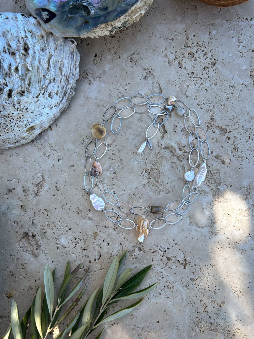 Ručně vyrobený náhrdelník/náramek pravých perel, minerálních kamenů, kousků korálu a chirurgické oceli.