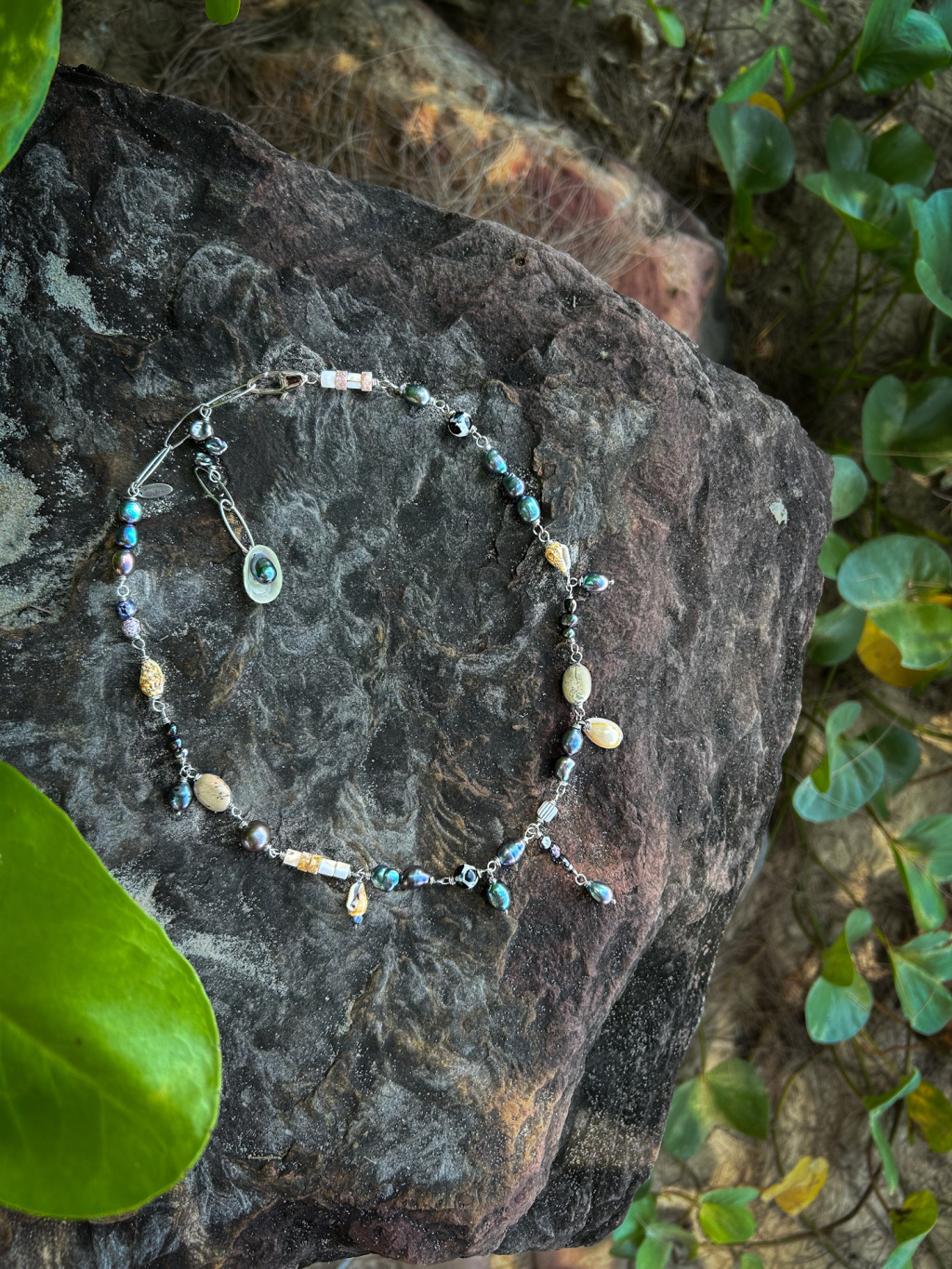 Ručně vyrobený náhrdelník z chirurgické oceli, z pravých černých říčních perel, minerálního kamene, korálu a mušlí.
