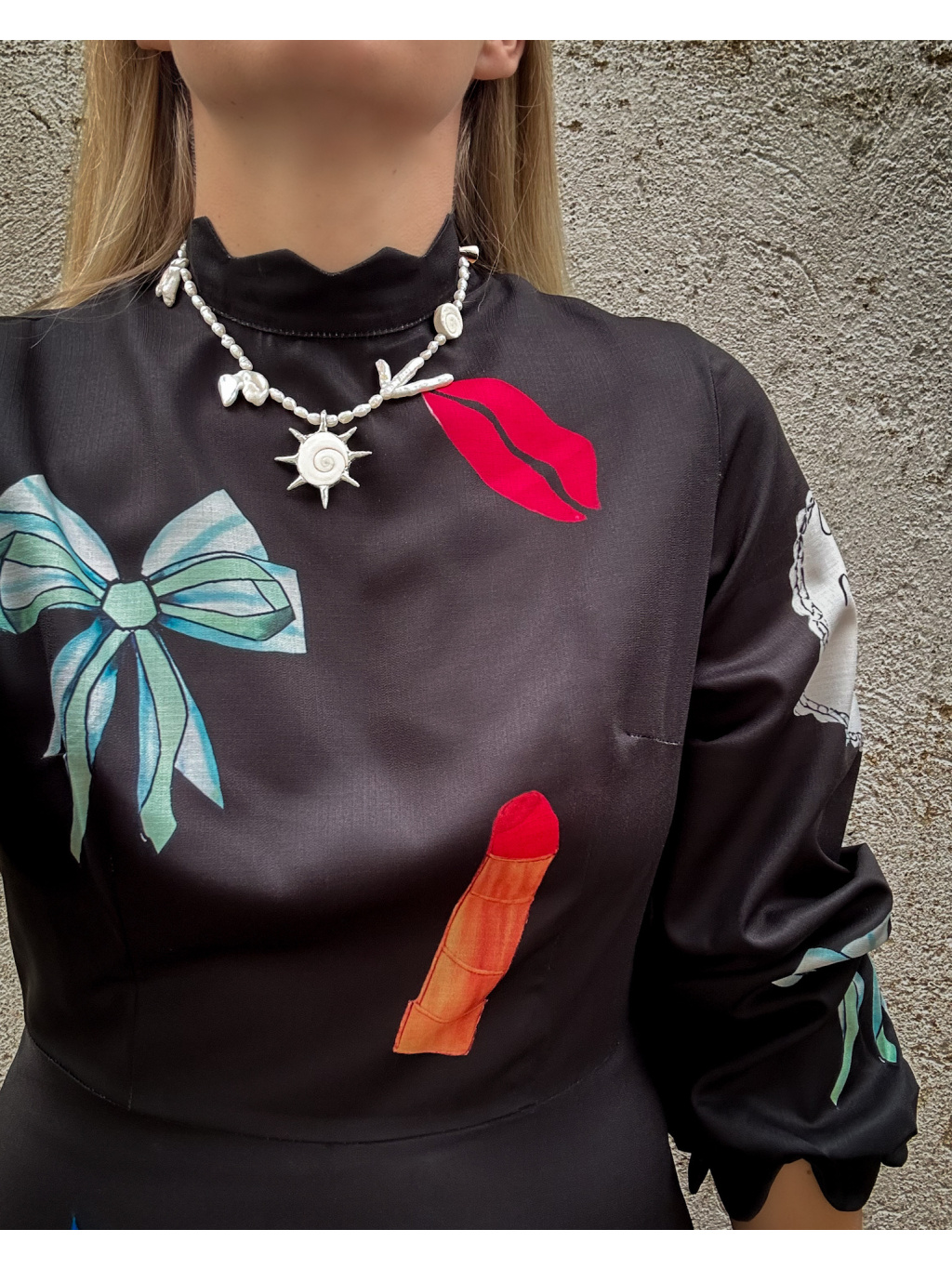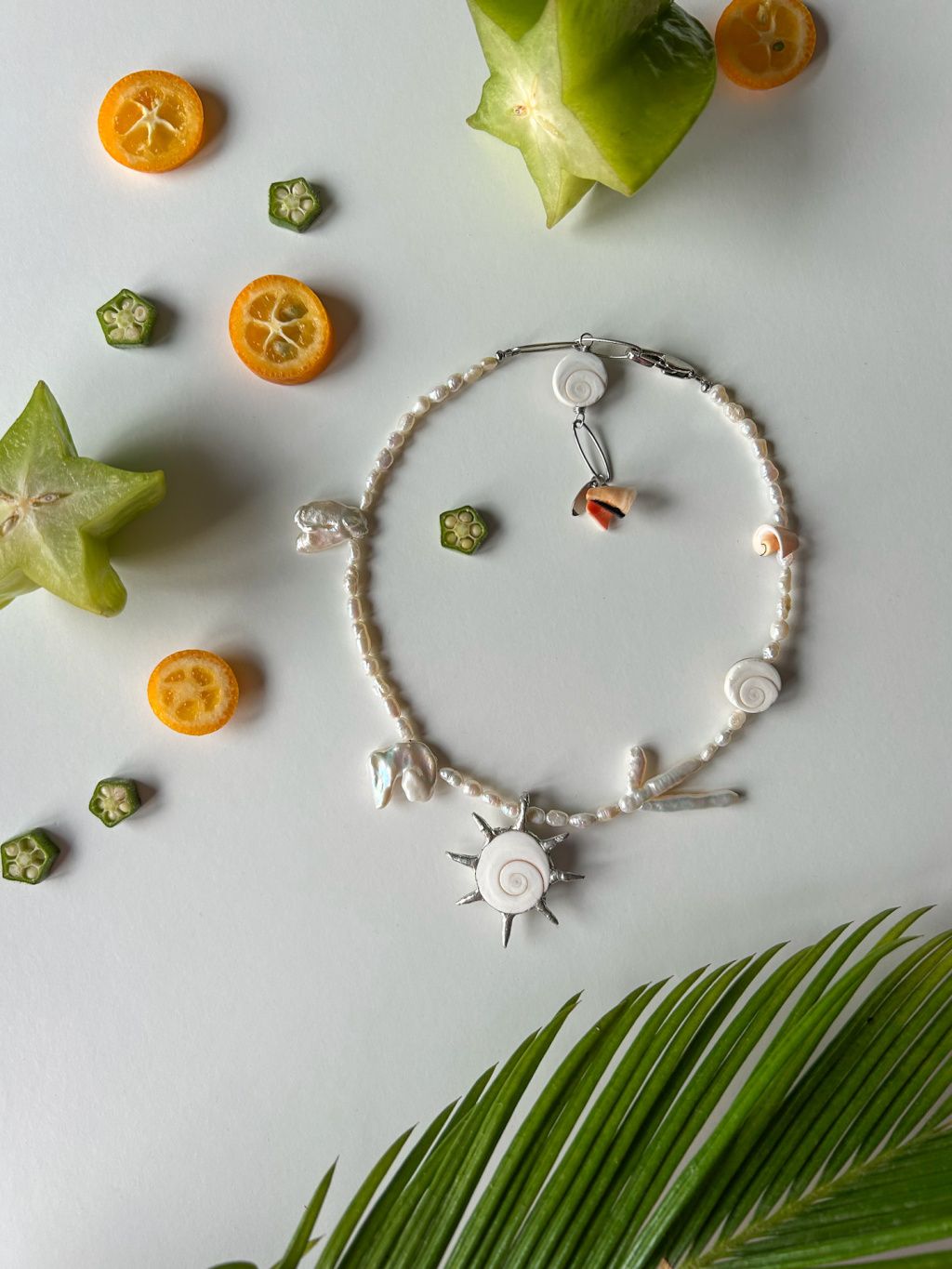 Denní amulet je ručně vyrobený náhrdelník z chirurgické oceli, z pravých říčních perel a mušlí.