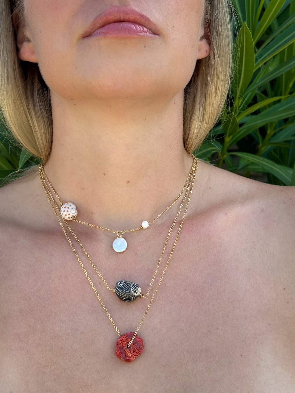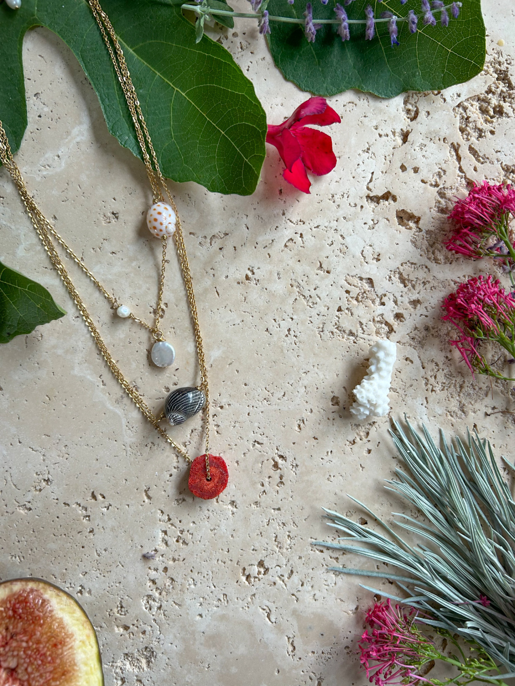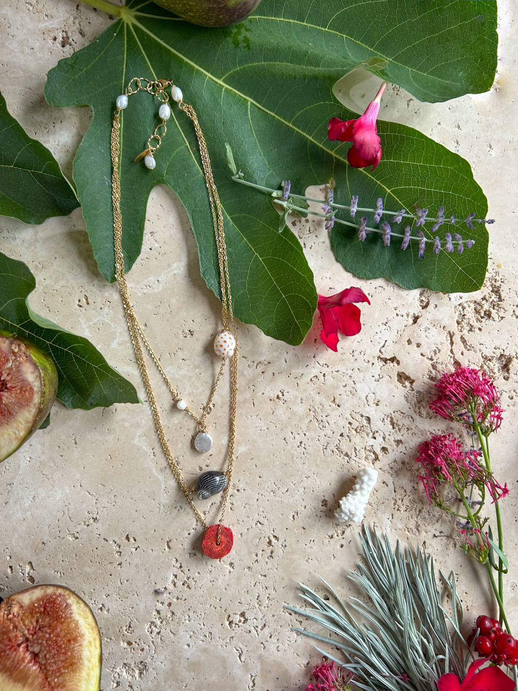 Ručně vyrobený náhrdelník z pravých říčních perel, korálu, mušlí a z pozlacené chirurgické oceli.