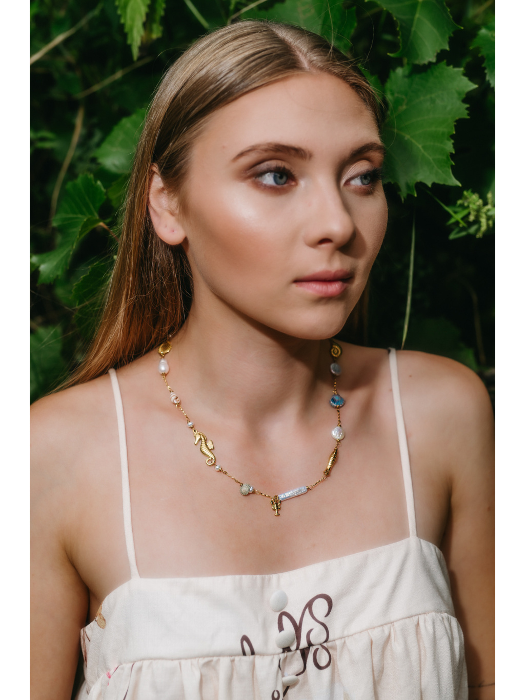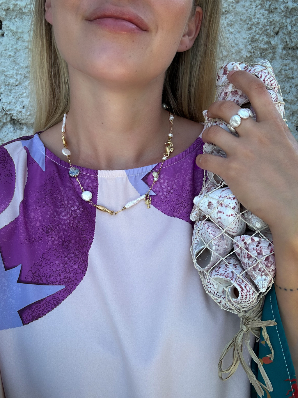 Ručně vyrobený náhrdelník z pravých říčních perel, keramiky, mušlí a z pozlacené chirurgické oceli.