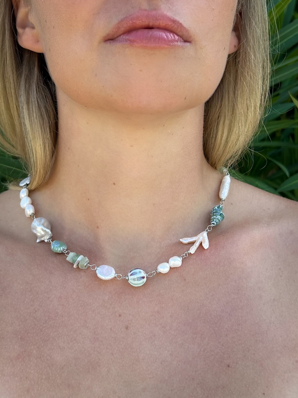 Ručně vyrobený náhrdelník z chirurgické oceli, z pravých říčních perel, minerálních kamenů a keramických korálků.