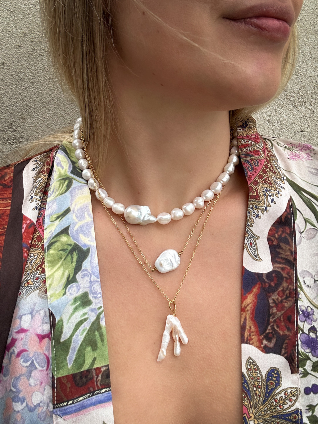 Ručně vyrobený náhrdelník pravých perel, minerálního kamene a pozlacené chirurgické oceli.
