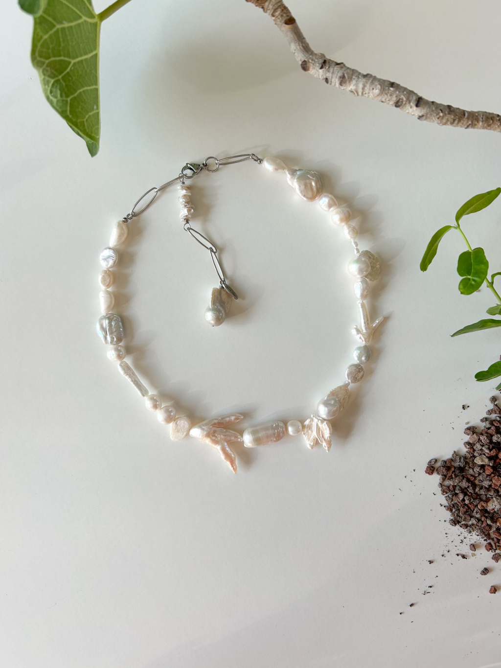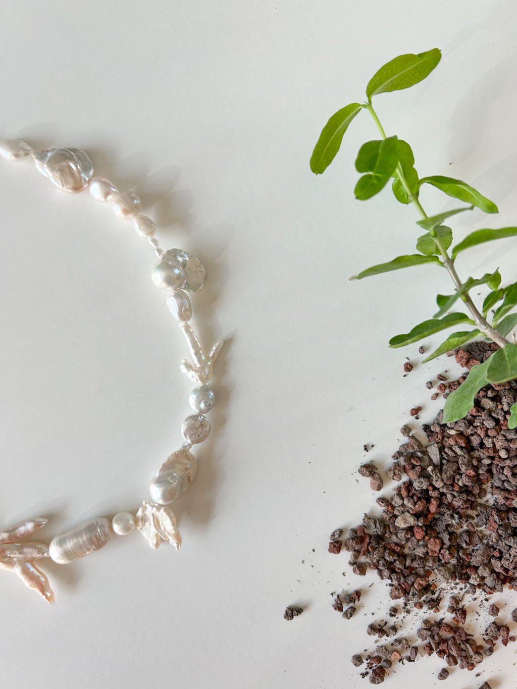 Ručně vyrobený náhrdelník kombinující pravé perly a chirurgickou ocel.