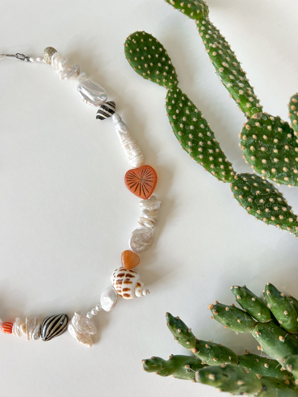 Ručně vyrobený náhrdelník z perel, skla, mušlí a z chirurgické oceli.