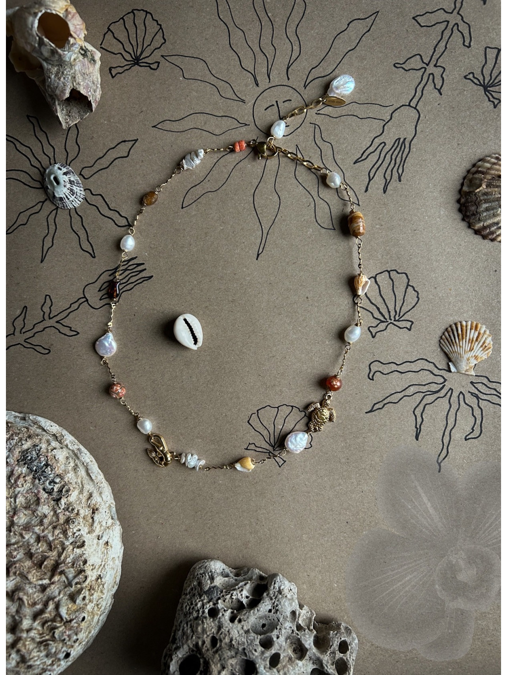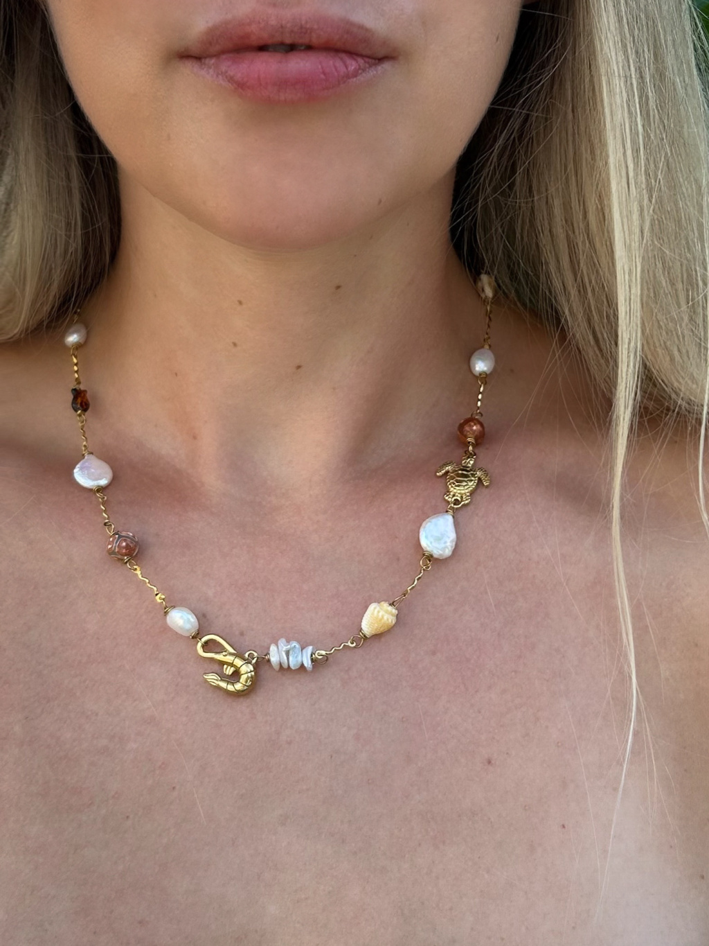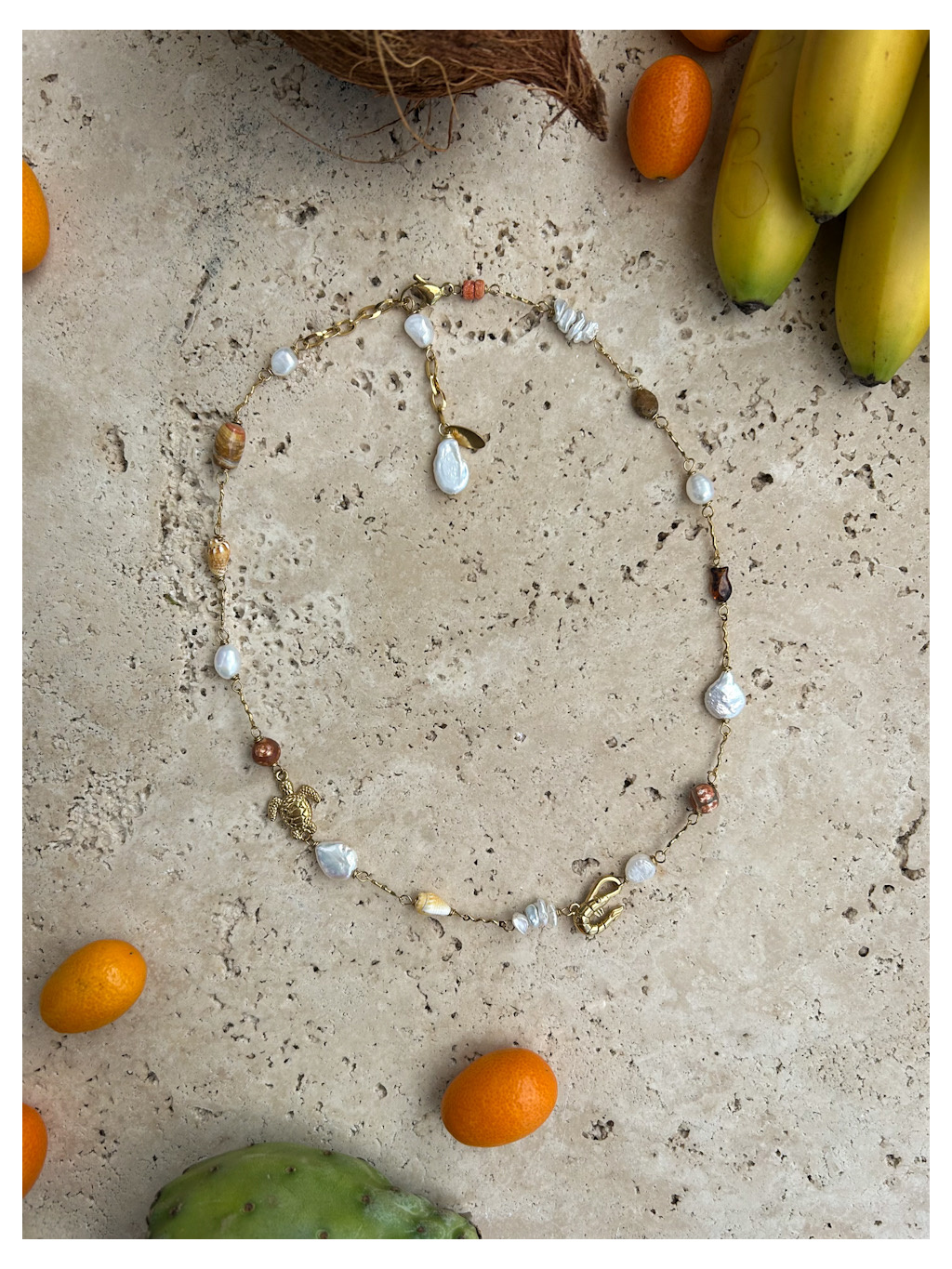 Ručně vyrobený náhrdelník z pravých říčních perel, minerálů, mušlí a z pozlacené chirurgické oceli.