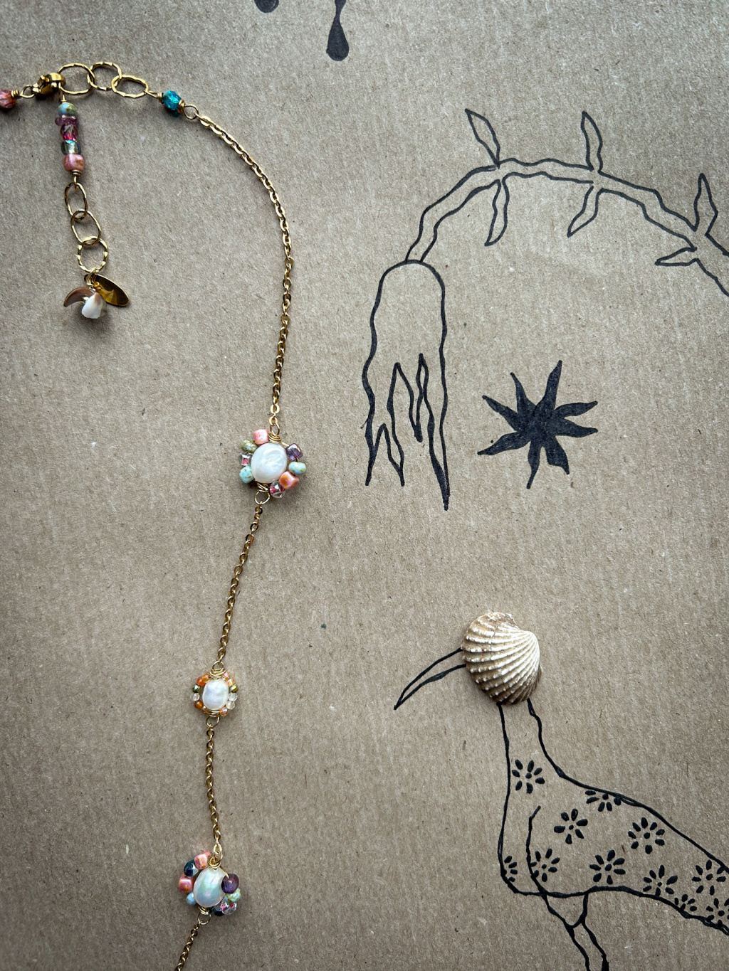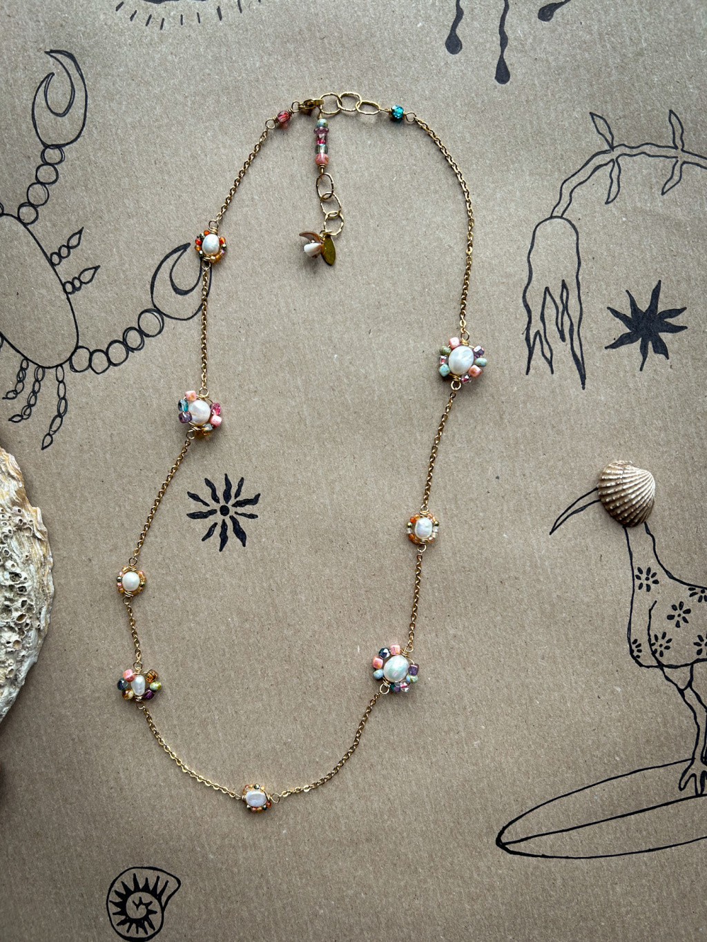 Ručně vyrobený náhrdelník z pravých říčních perel, korálků ze skla a keramiky a z pozlacené chirurgické oceli.