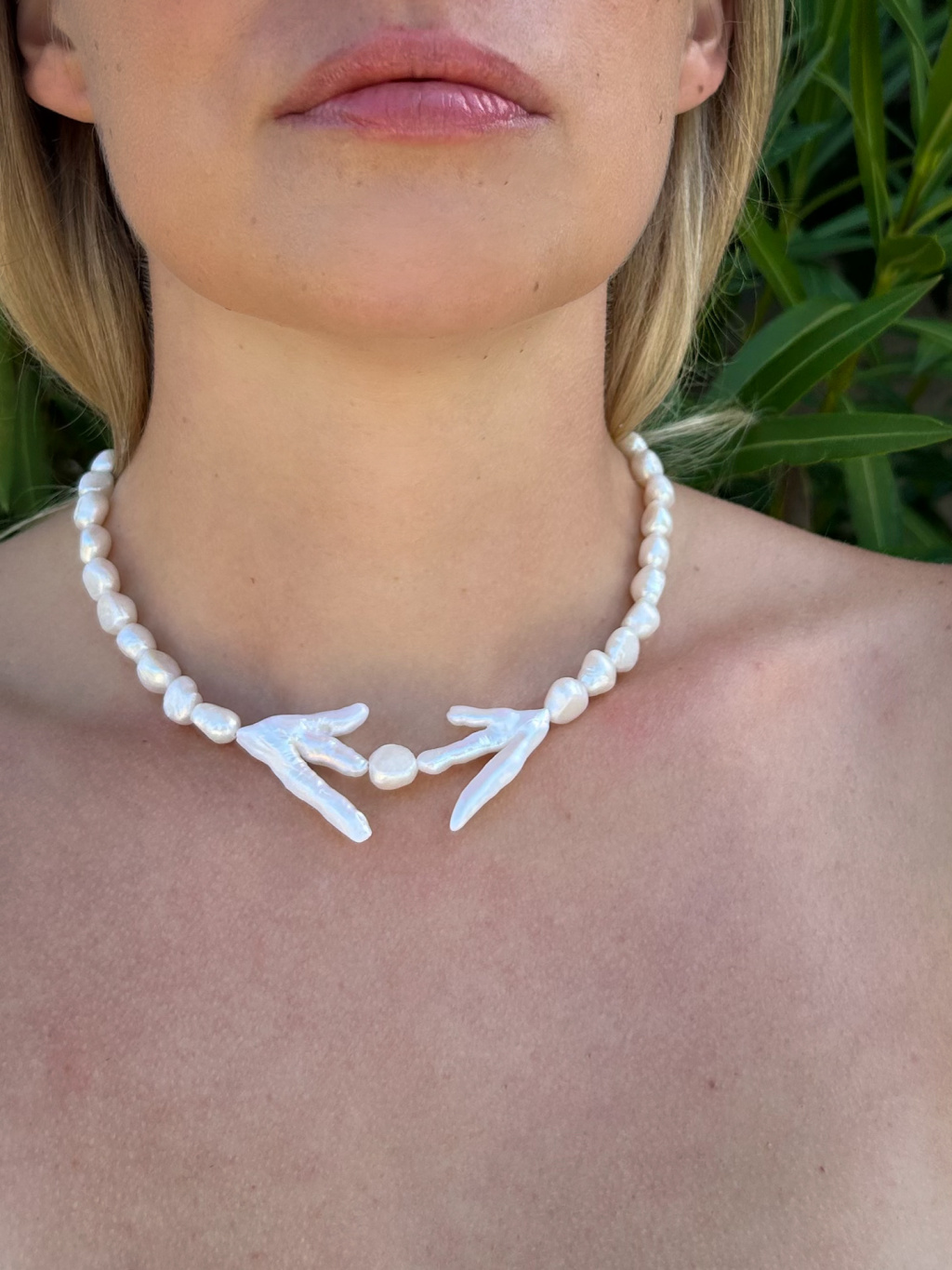 Ručně vyrobený náhrdelník z pravých říčních perel a z pozlacené chirurgické oceli.