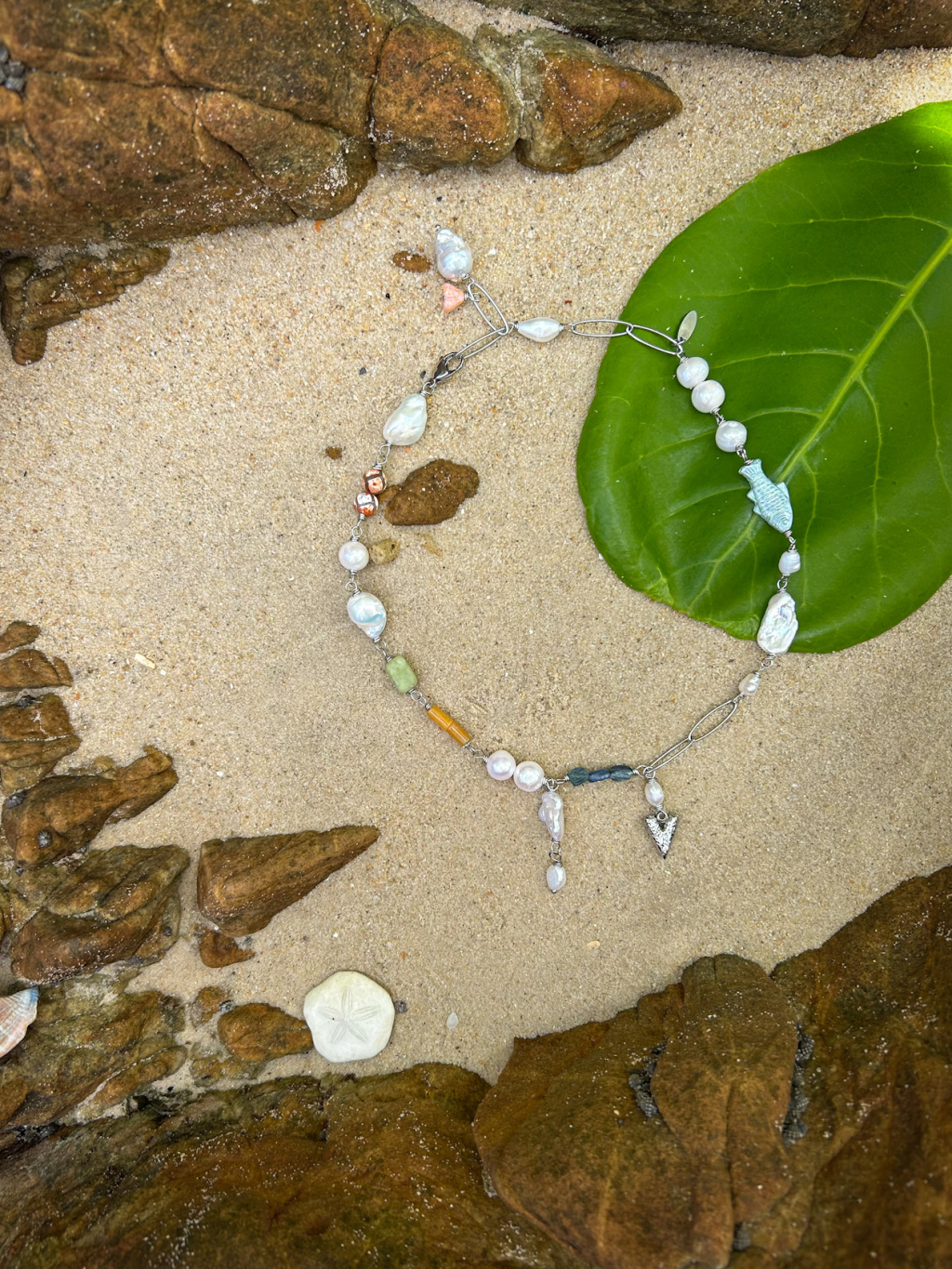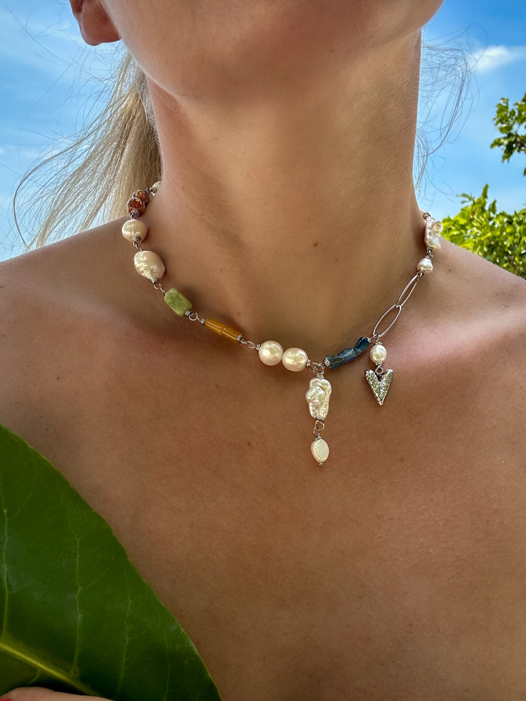 Ručně vyrobený náhrdelník z pravých perel, minerálního kamene a chirurgické oceli.