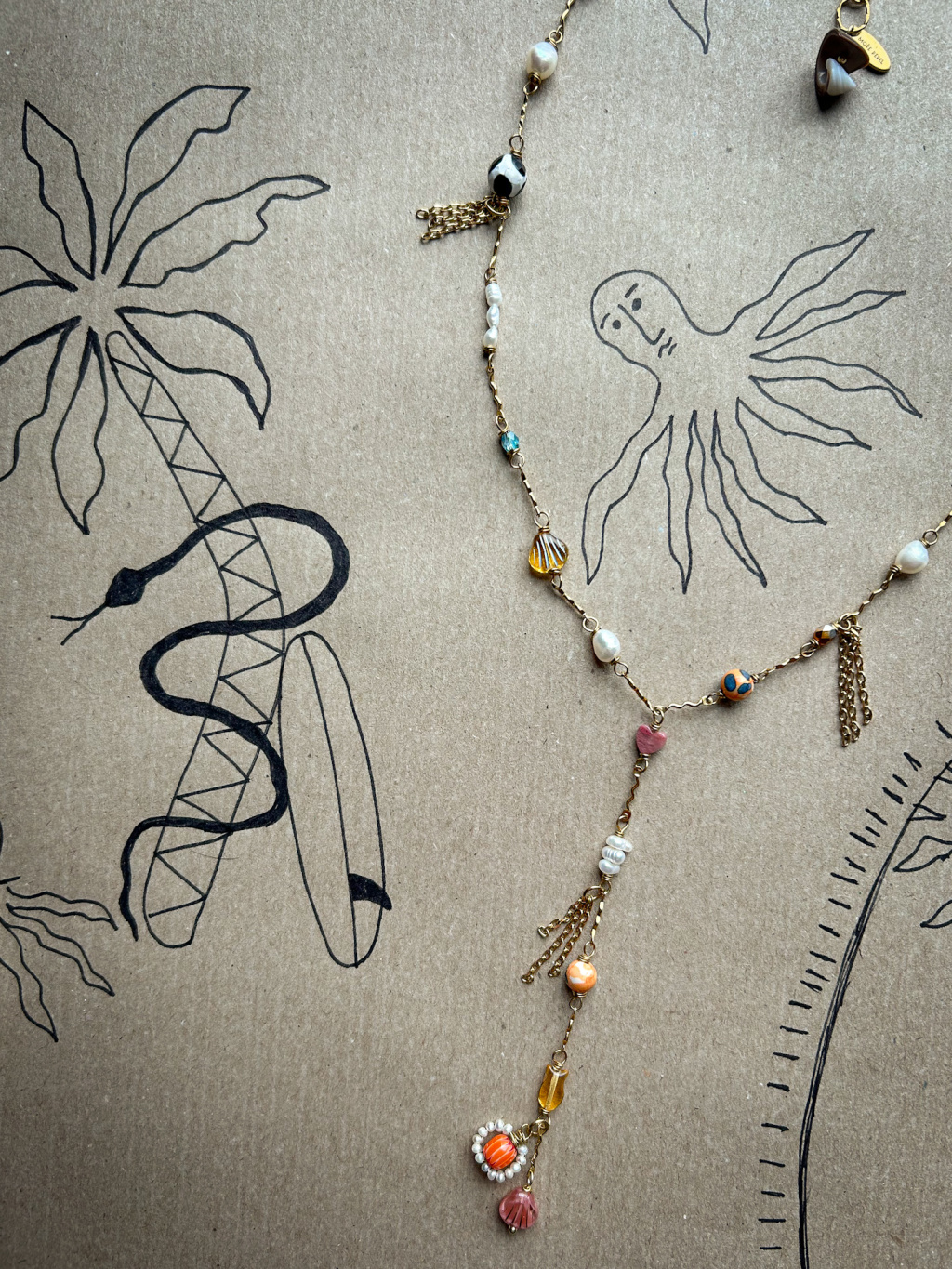 Ručně vyrobený náhrdelník z pravých perel, keramiky, minerálního kamene, skla a pozlacené chirurgické oceli.