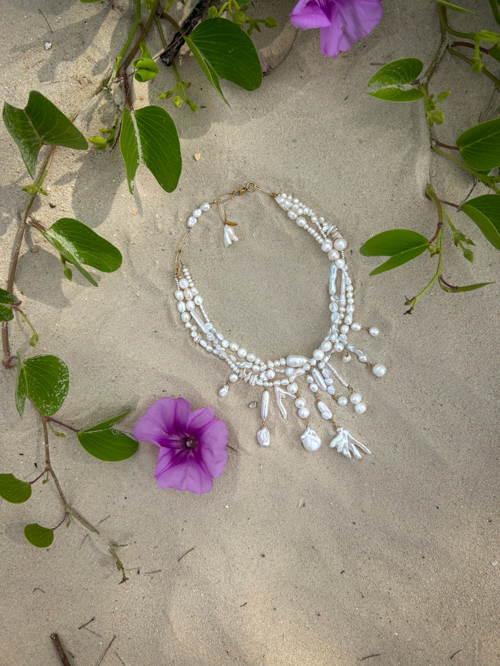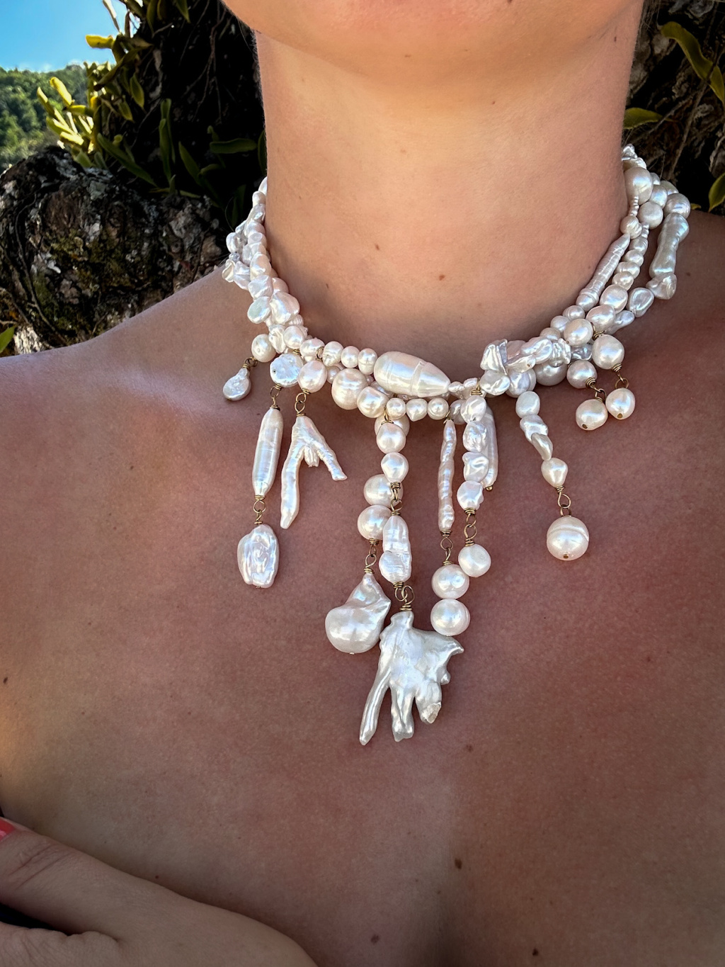 Ručně vyrobený náhrdelník z pozlacené chirurgické oceli a ze spletitých šňůr perel s mnoha perlovými přívěsky.