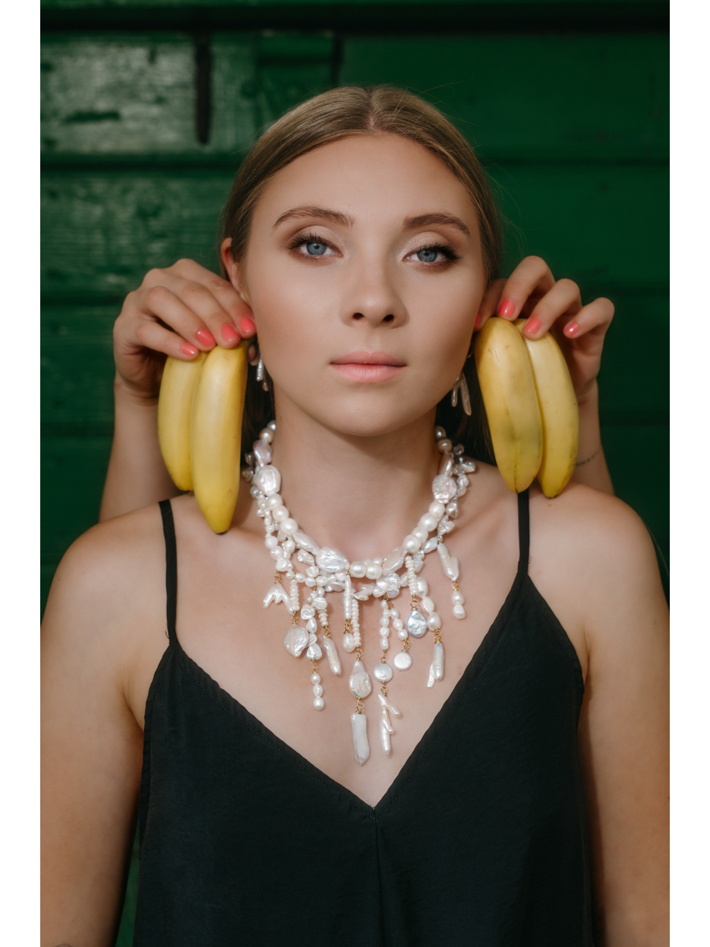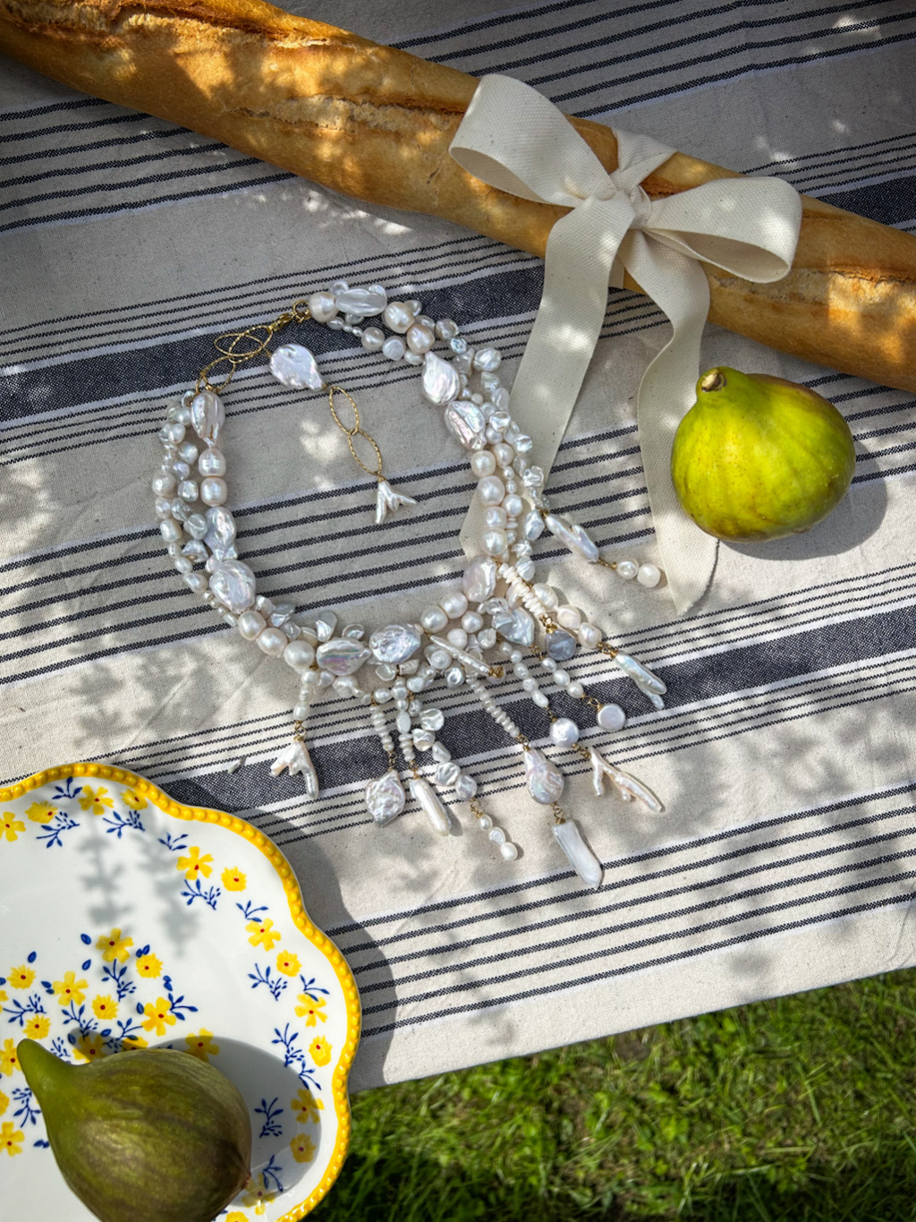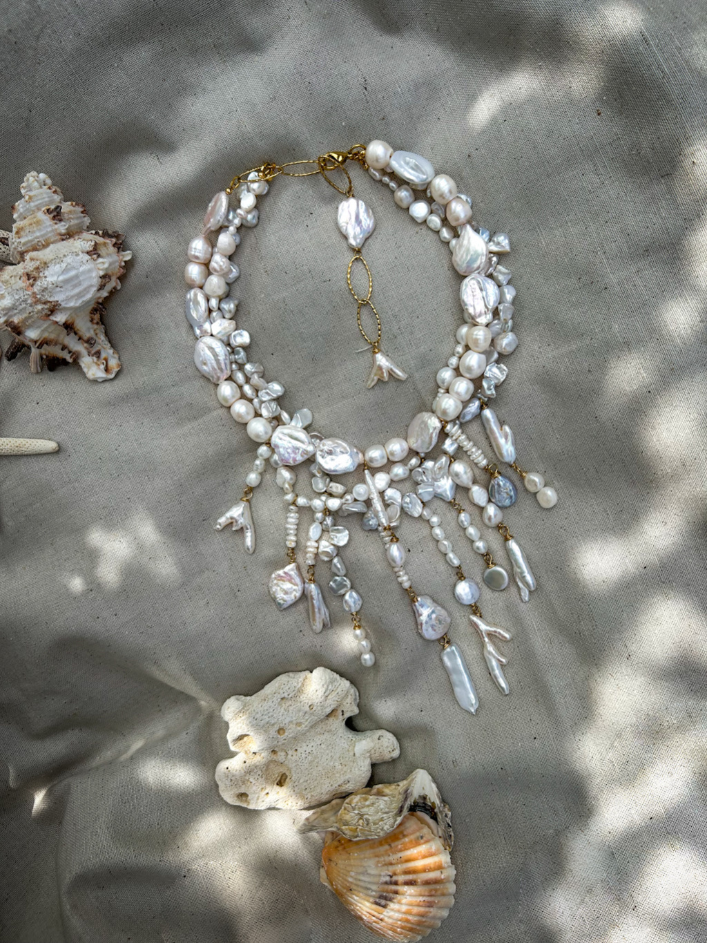 Ručně vyrobený náhrdelník z pozlacené chirurgické oceli a ze spletitých šňůr perel s mnoha perlovými přívěsky.