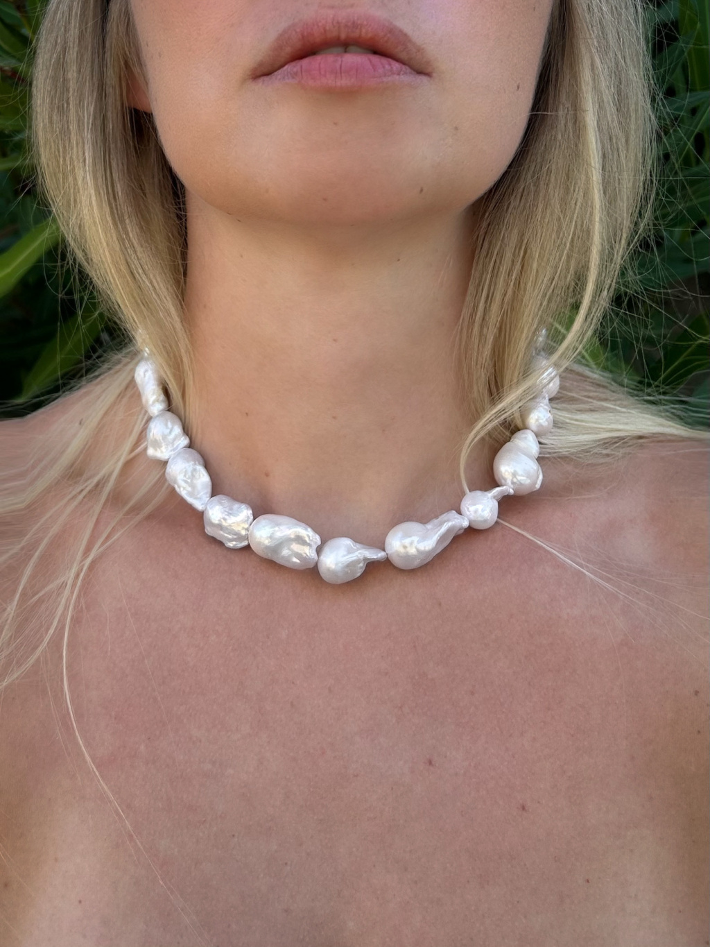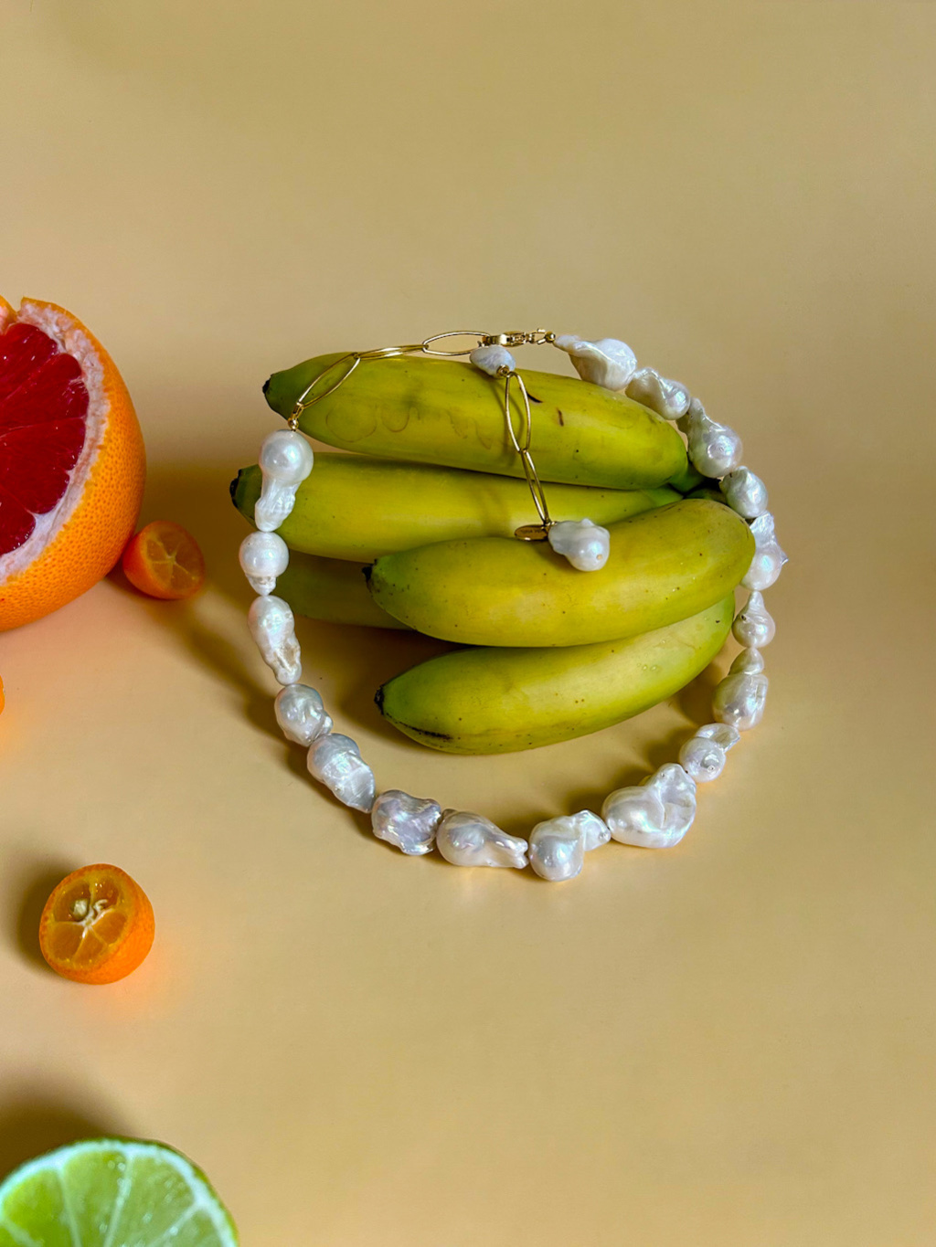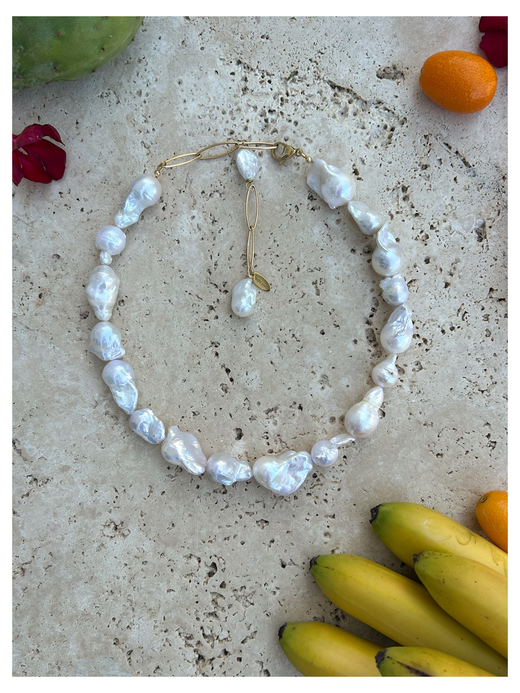Ručně vyrobený náhrdelník z pozlacené chirurgické oceli a z pravých raritních barokních perel.