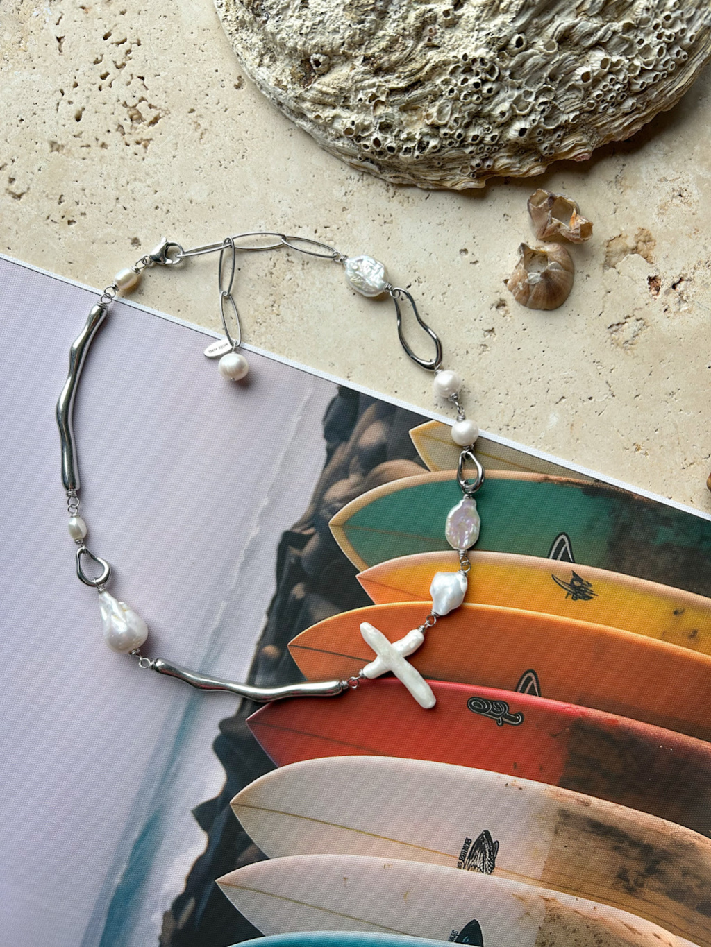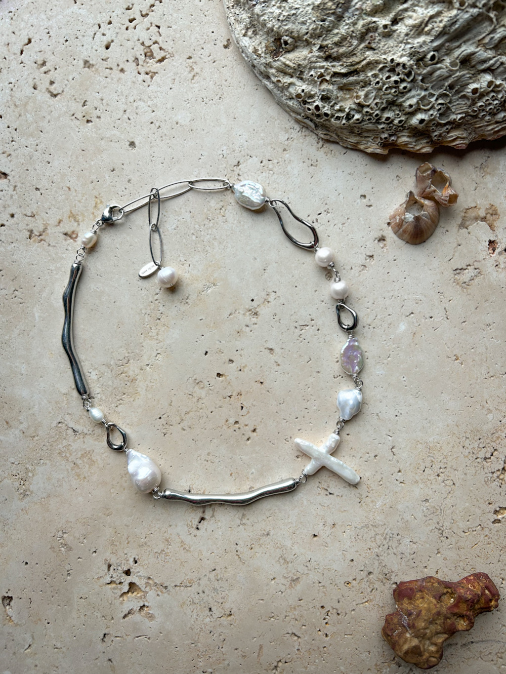 Ručně vyrobený náhrdelník z chirurgické oceli a ze sladkovodních pravých perel.