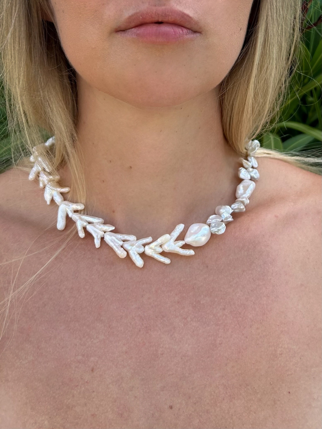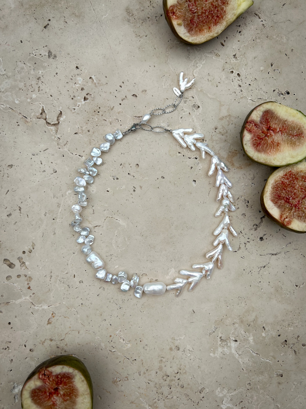 Ručně vyrobený náhrdelník z fragmentů perel a z chirurgické oceli. Délka náhrdelníku okolo krku je 40-48 cm (u náhrdelníku lze puzetkou upravovat délku).