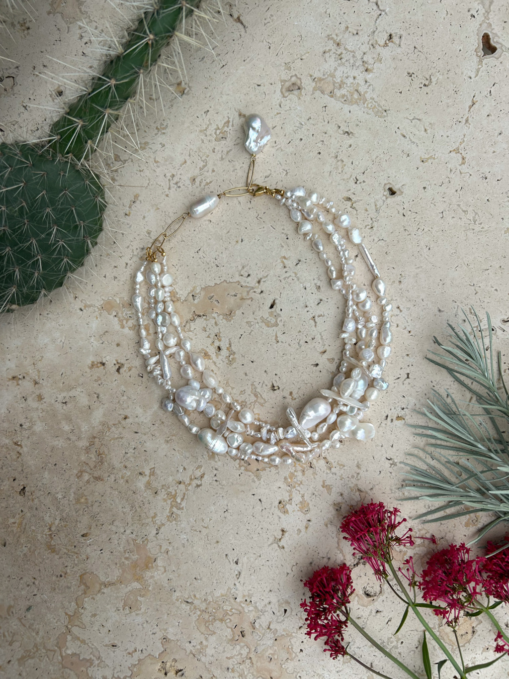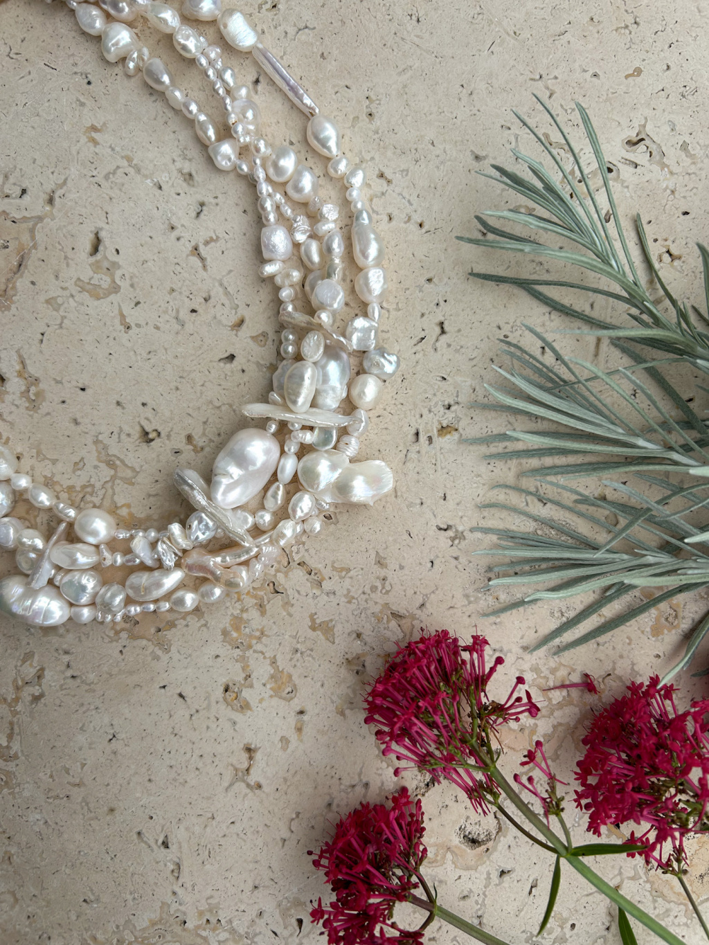 Ručně vyrobený náhrdelník z pozlacené chirurgické oceli a z pravých říčních perel.