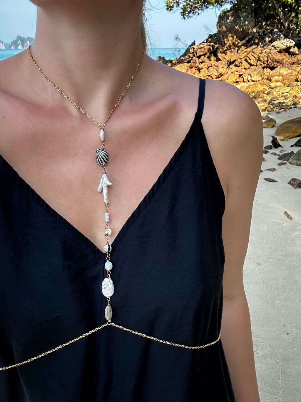 Ručně vyrobený náhrdelník přes celé tělo z pravých říčních perel, mušlí, minerálního kamene a pozlacené chirurgické oceli.