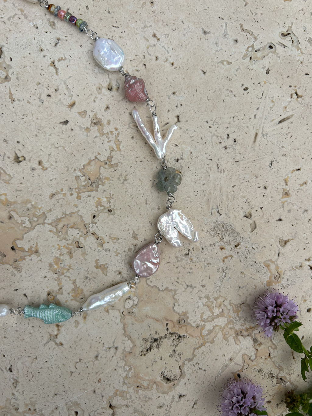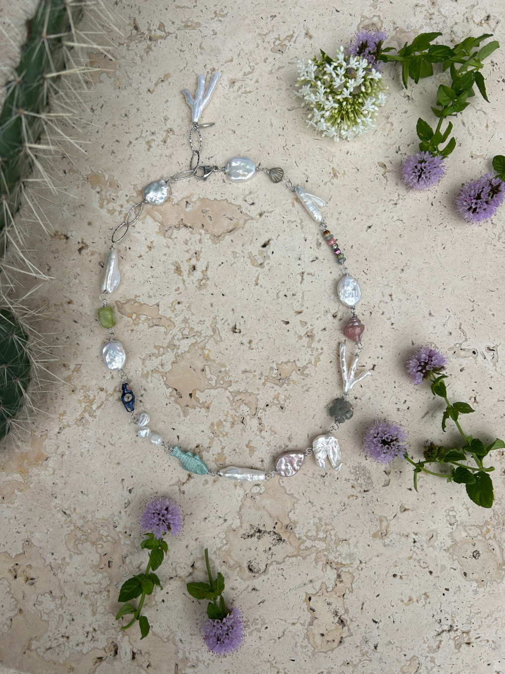 Ručně vyrobený náhrdelník z pravých perel, minerálních kamenů, skla a z chirurgické oceli.