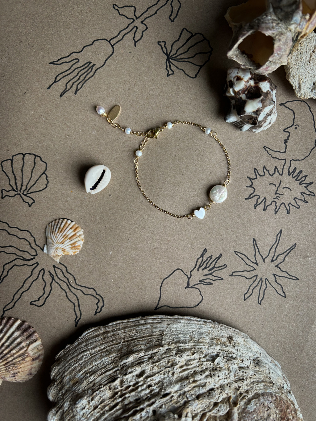 Ručně vyrobený náramek pravých říčních perel, korálu a pozlacené chirurgické oceli.