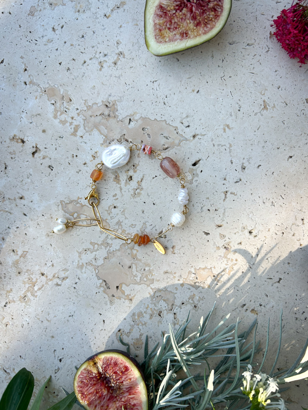 Ručně vyrobený náramek z pravých perel, minerálních kamenů a z pozlacené chirurgické oceli.