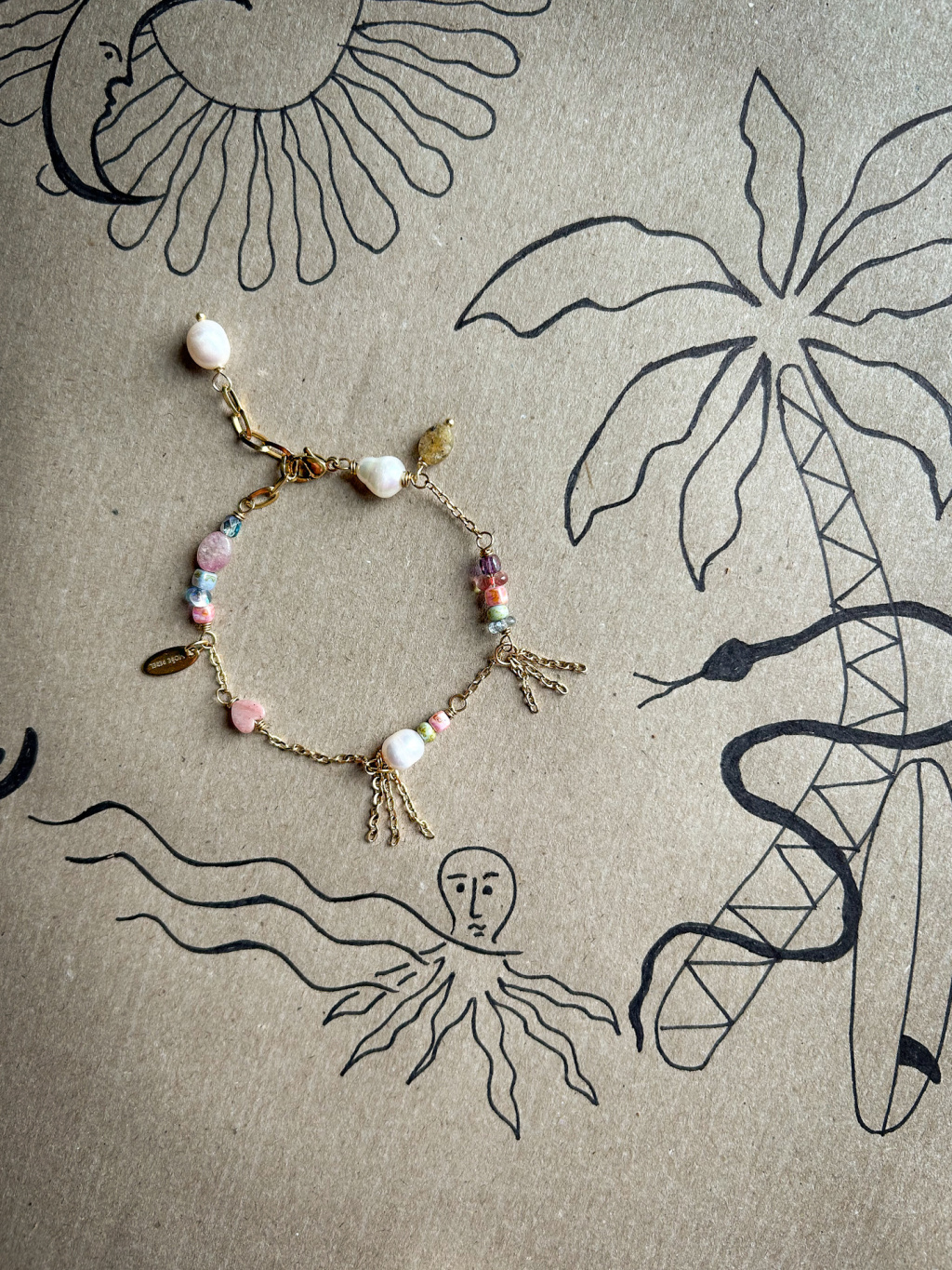 Ručně vyrobený náramek z pravých perel, minerálních kamenů, skla a z pozlacené chirurgické oceli.