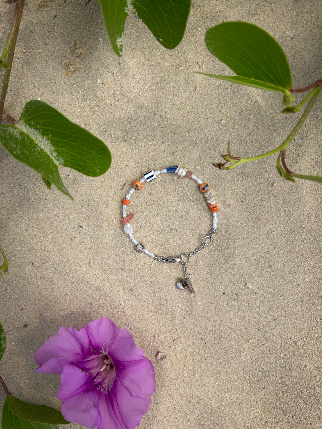 Ručně vyrobený náramek z pravých perel, skla, minerálních kamenů a z chirurgické oceli.