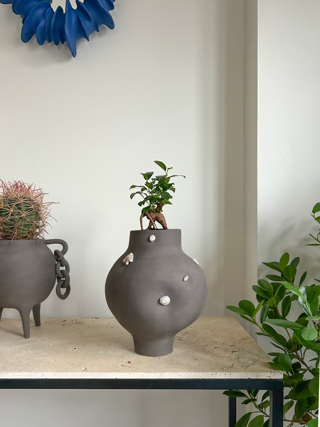 Ručně vytvořená váza z pálené keramiky dodekorovaná pravými říčními perlami (jedná se o výrobek vpravo). Váza je doplněna o Ficus Ginseng zasazený v substrátu.