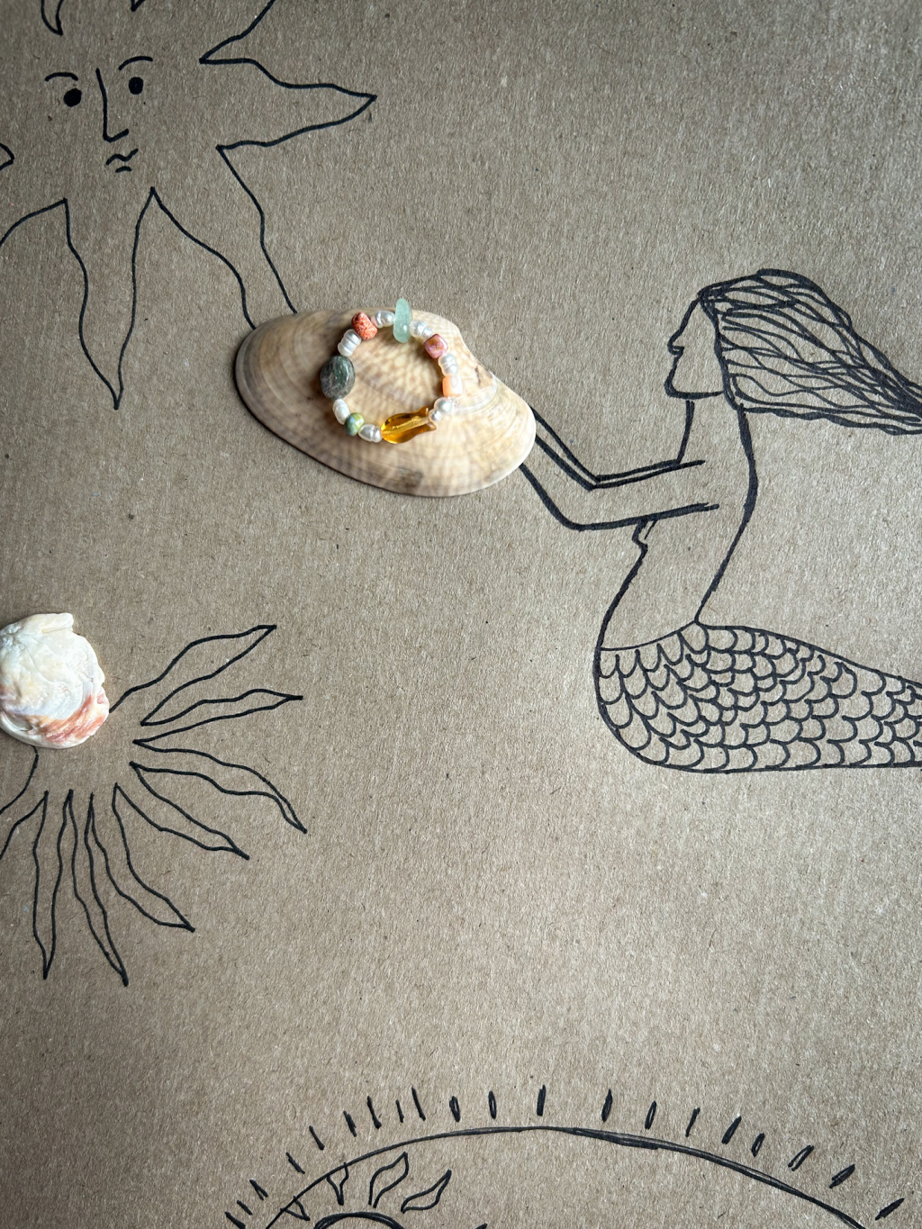 Prsten z pravých perel, minerálních kamínků, skleněné rybky a korálu. Velikost prstýnku je variabilní, je navlečen na elastické šperkařské gumičce.