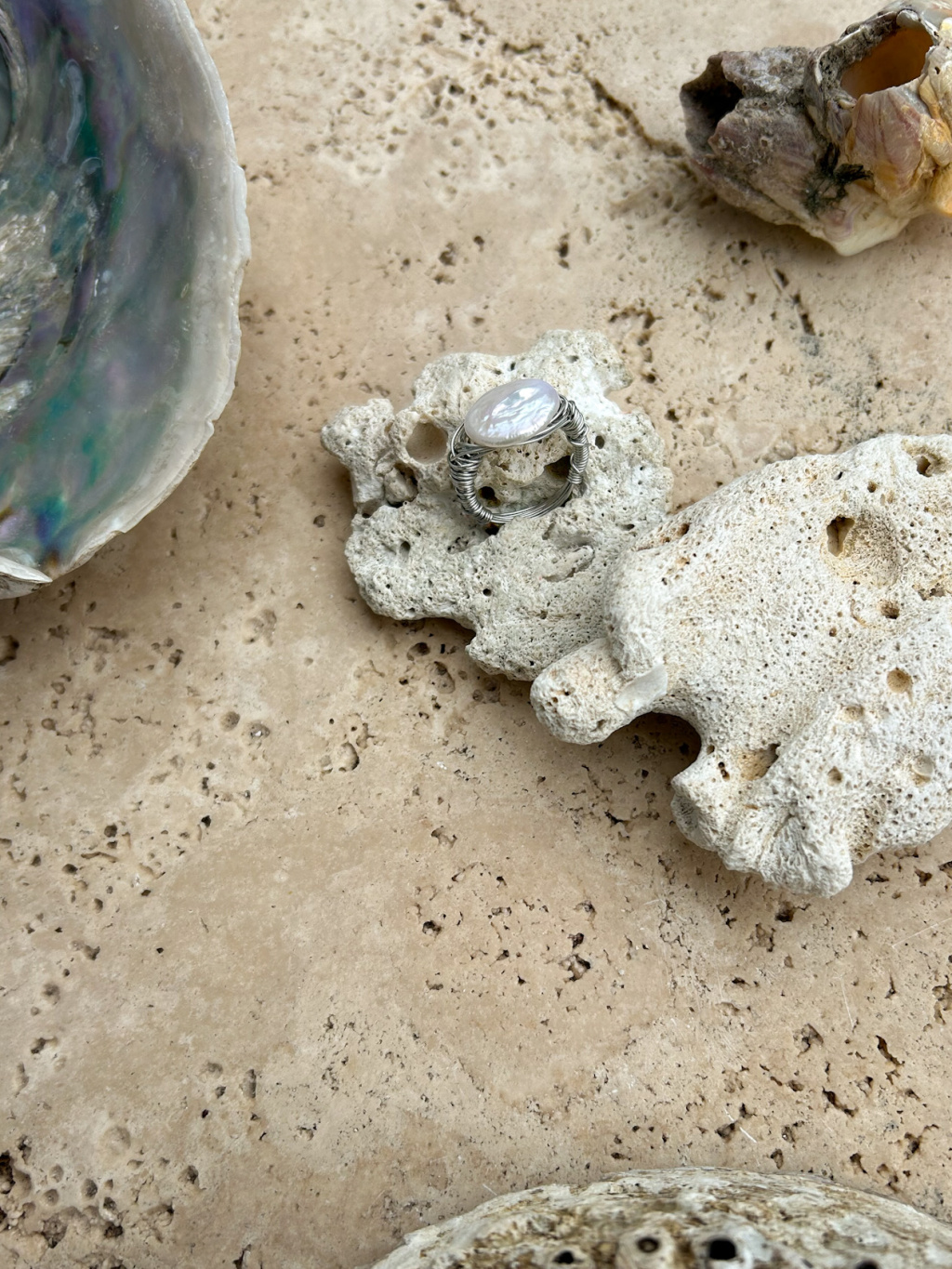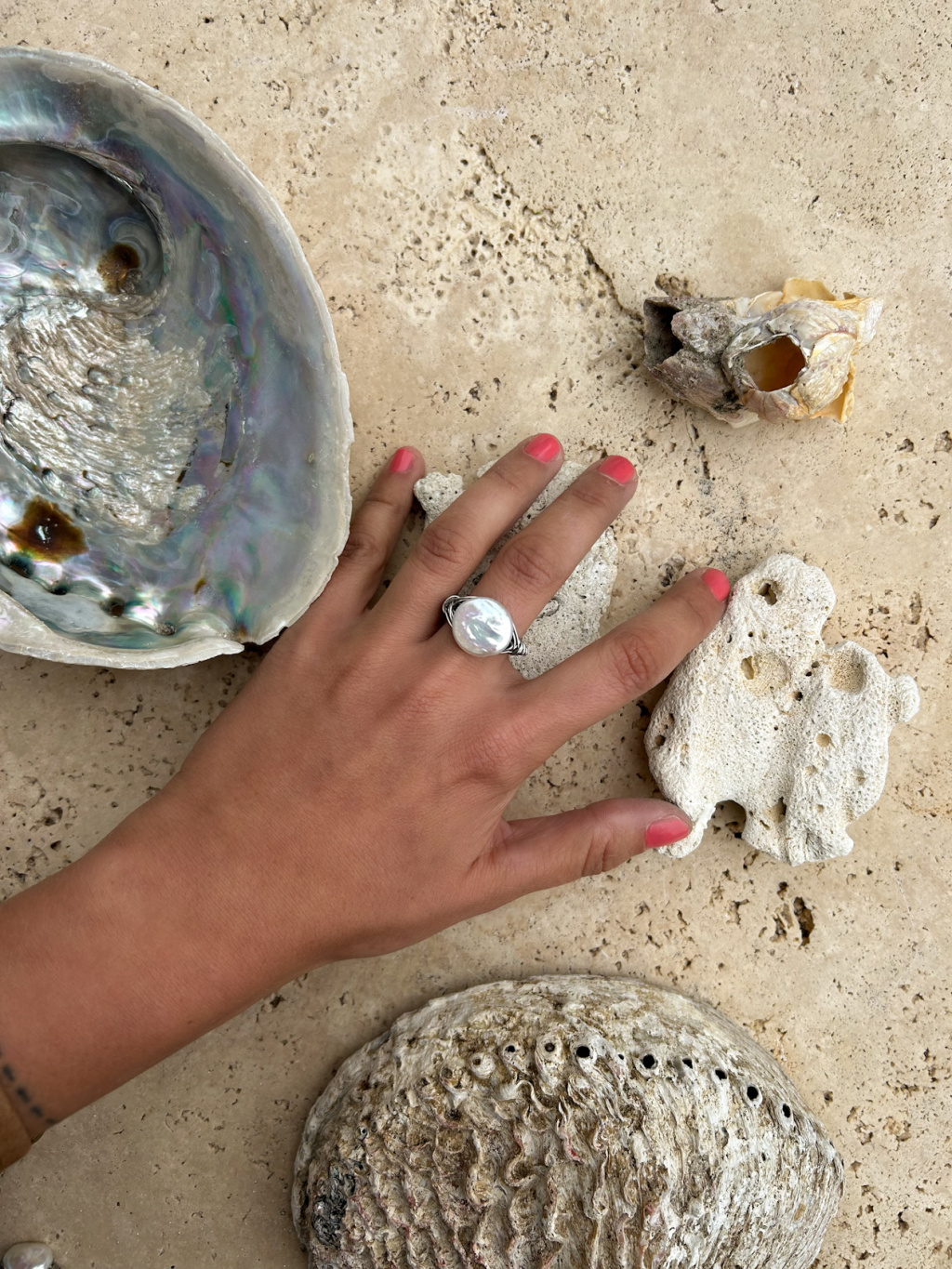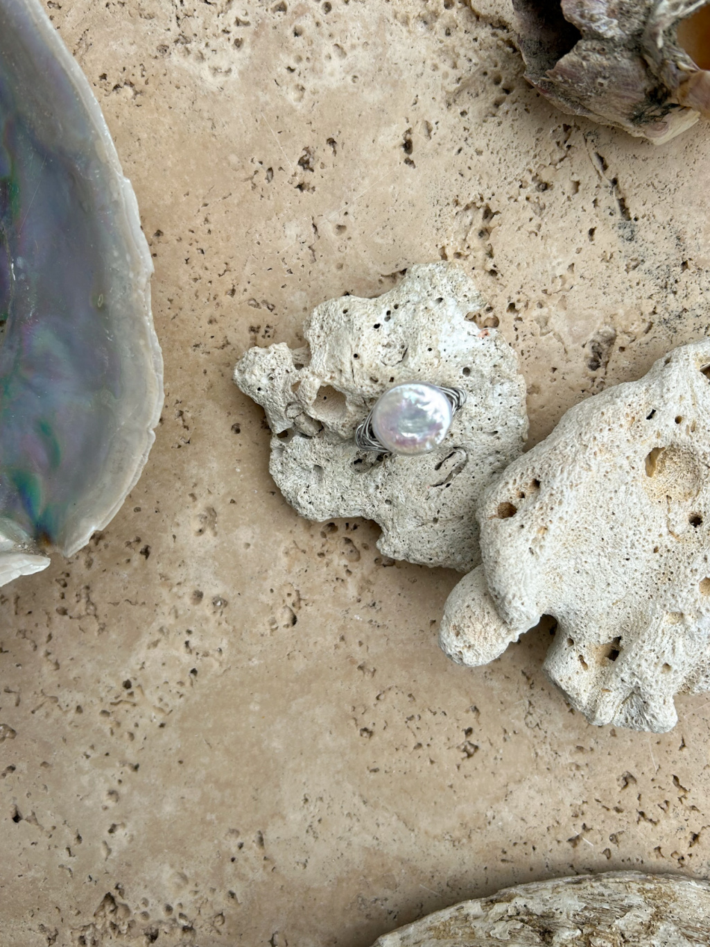 Prsten z chirurgické oceli s pravou velkou říční perlou.