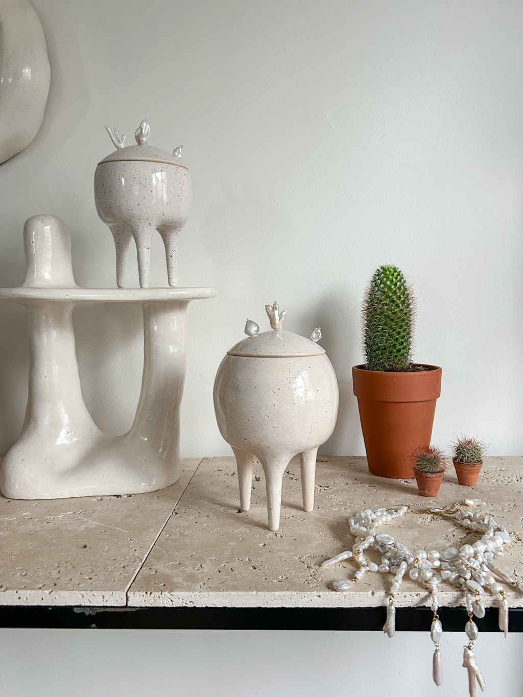 Ručně vyrobená šperkovnice z pálené keramiky dodekorovaná pravými říčními perlami.