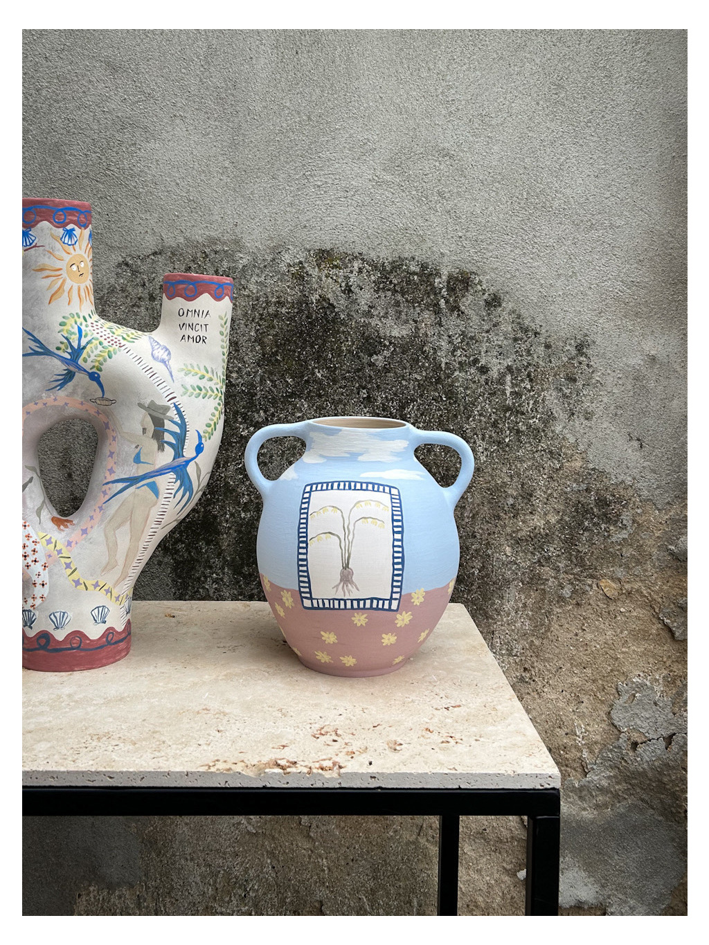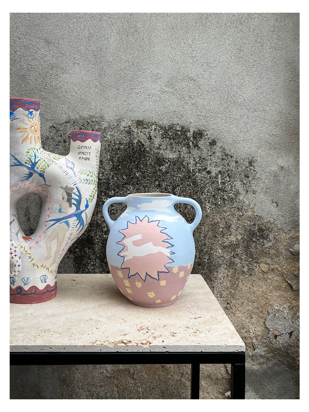 Ručně vytvořená váza z pálené keramiky. Váza je dodekorována malbou znázorňující rozkvetlou louku a nebe spolu s výjevy květin a skákajícího králíka.