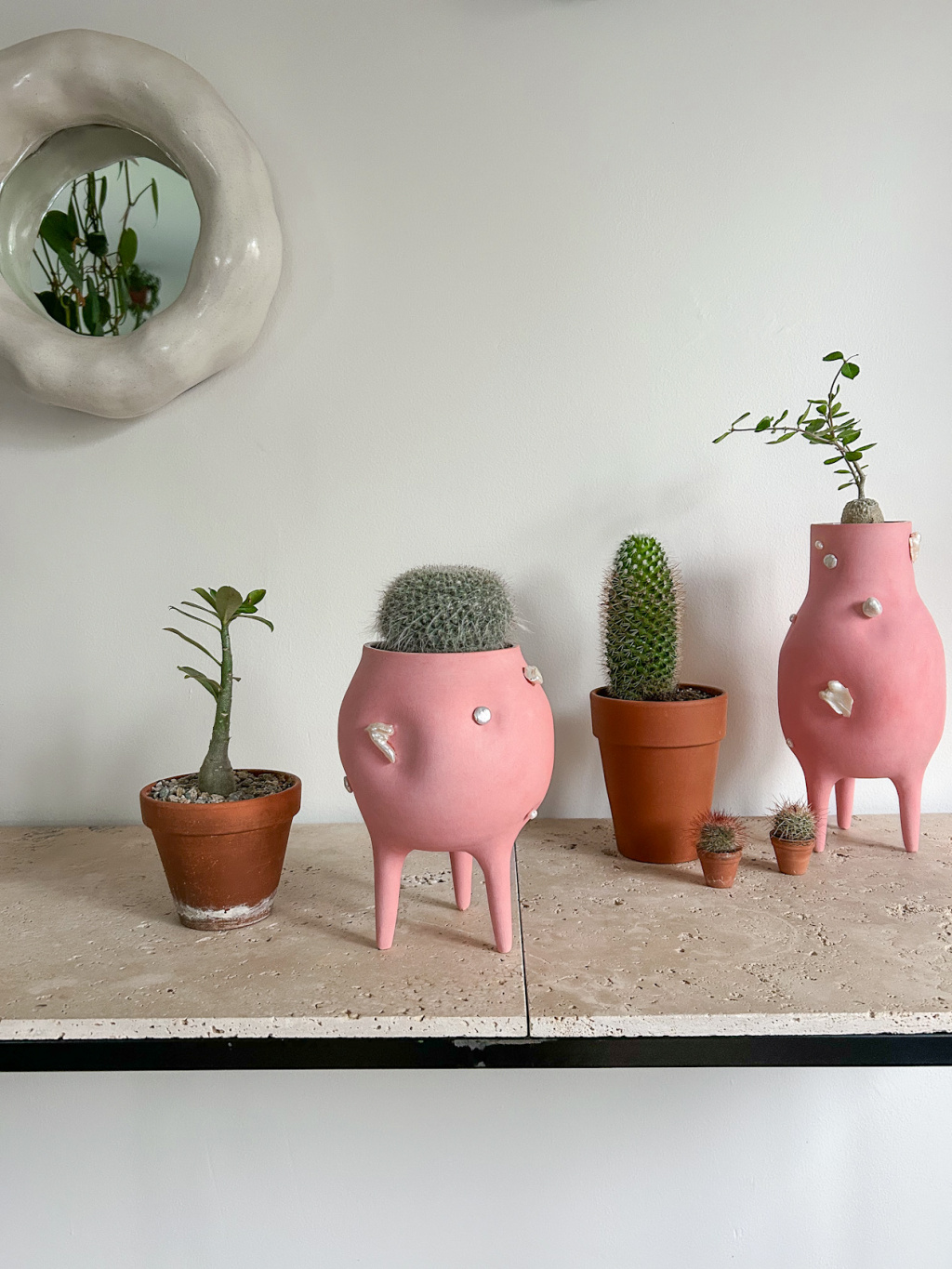 Ručně vytvořená váza s kaktusem z pálené keramiky. Váza je dodekorována pravými perlami.