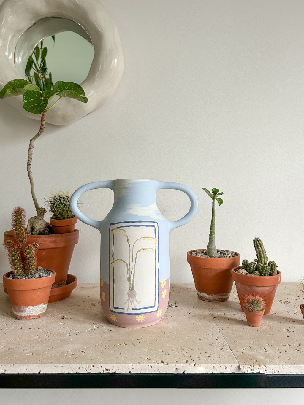 Ručně vytvořená váza z pálené keramiky. Váza je dodekorována malbou znázorňující rozkvetlou louku a nebe spolu s výjevy květin a skákajícího králíka.